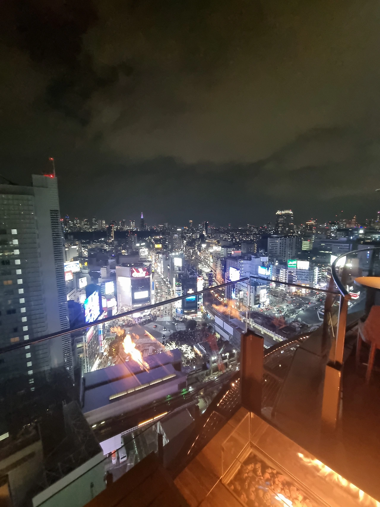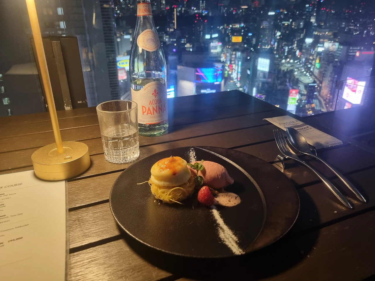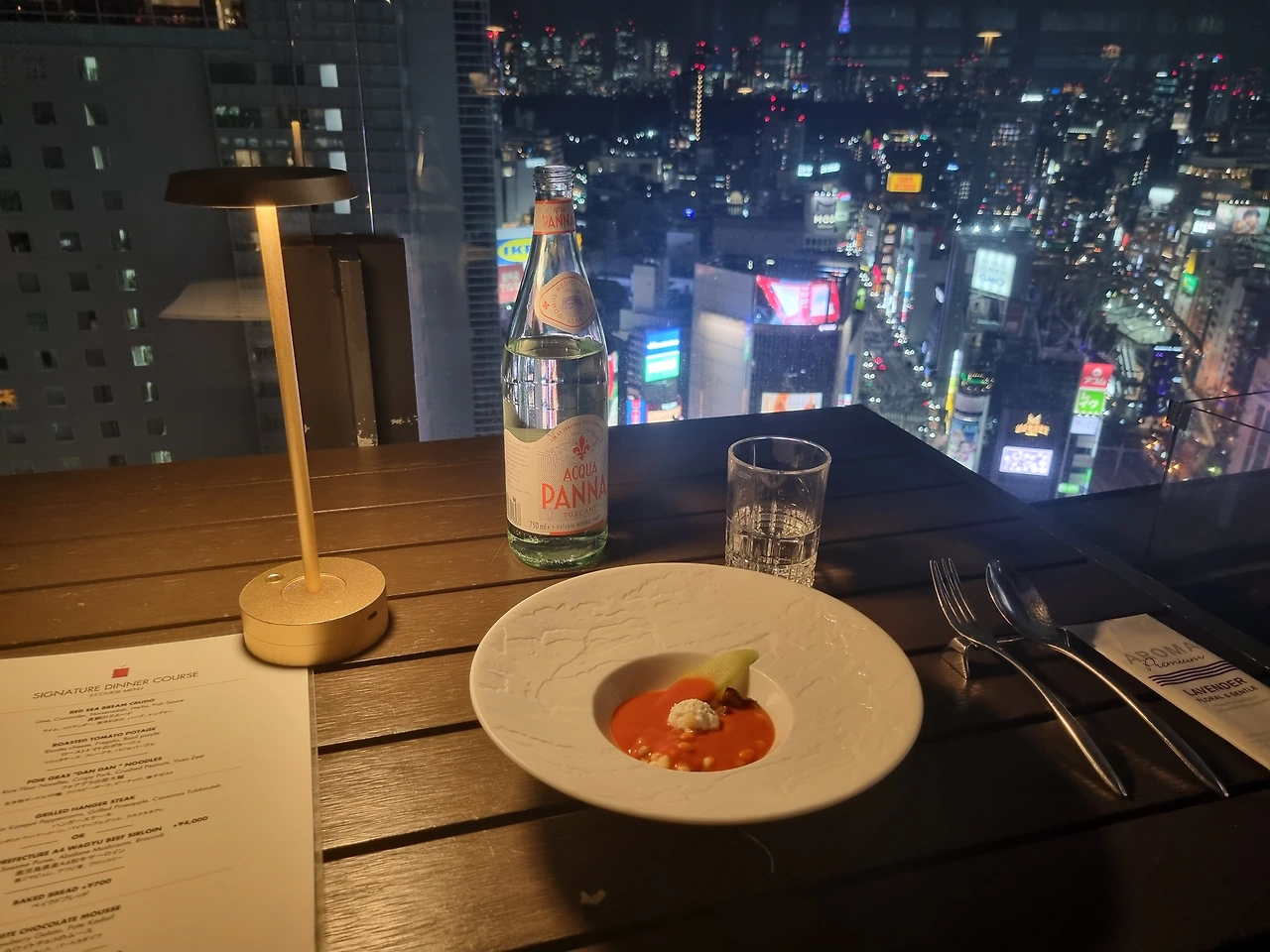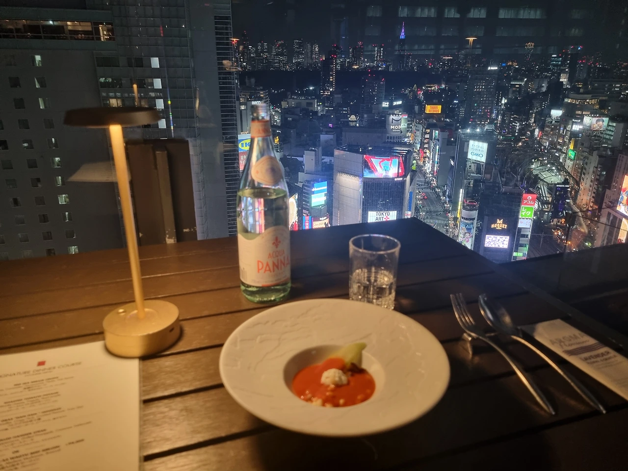 뷰는 아주 만족스러웠다. 교차로가 바로 정면으로 보이고, 스크램블 스퀘어가 좌측에 있는 좌석으로 안내해 주셨다. 다만 내 영어 스피킹 실력이 완전 죽었다는 것에서 충격을 좀 받았다. 한 4년 정도 안 쓰다 보니까 머릿속으로는 문장이 완성되는데 내뱉어지지가 않았다.. 아마 처음 와보는 초고급 식당이라 긴장해서 그럴 수도. 날씨가 쌀쌀했는데, 고층이라 그런가 칼바람이 무지 불었다. 내 양옆으로 불을 피워주셨는데, 거의 열 번 가량 꺼져서 직원분도 포기! 를 하셨다. 진짜 추웠다.