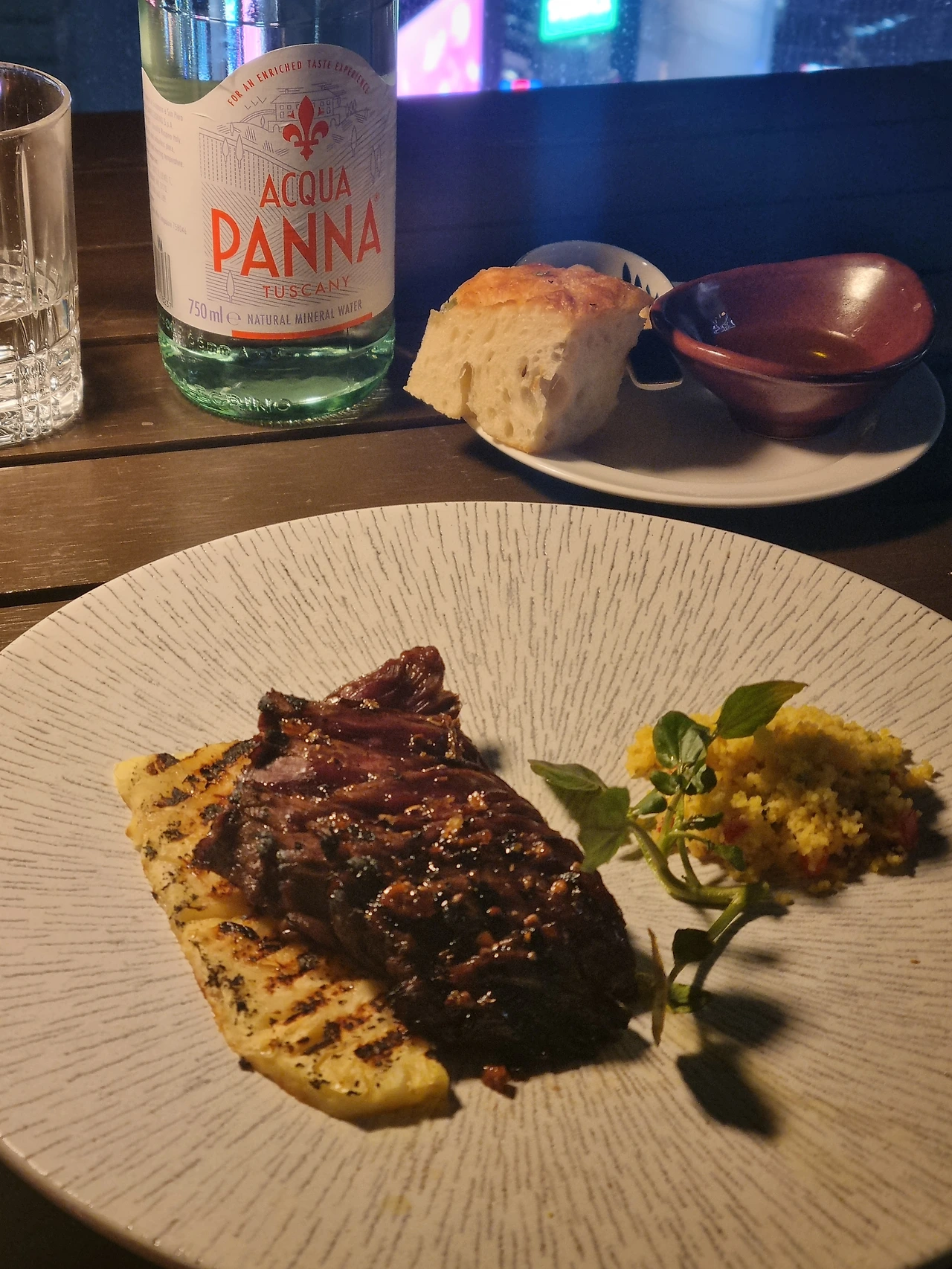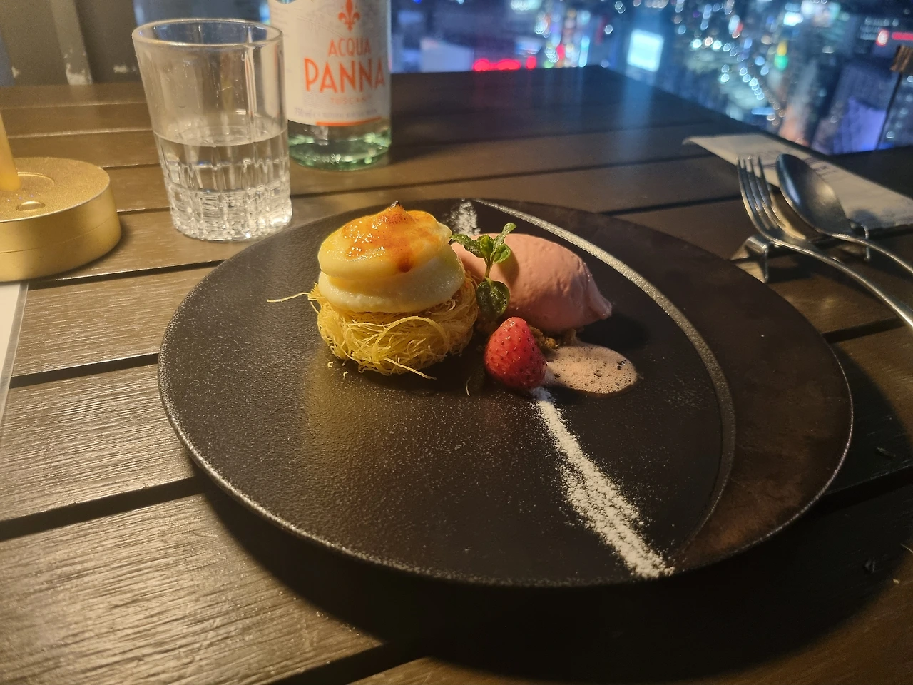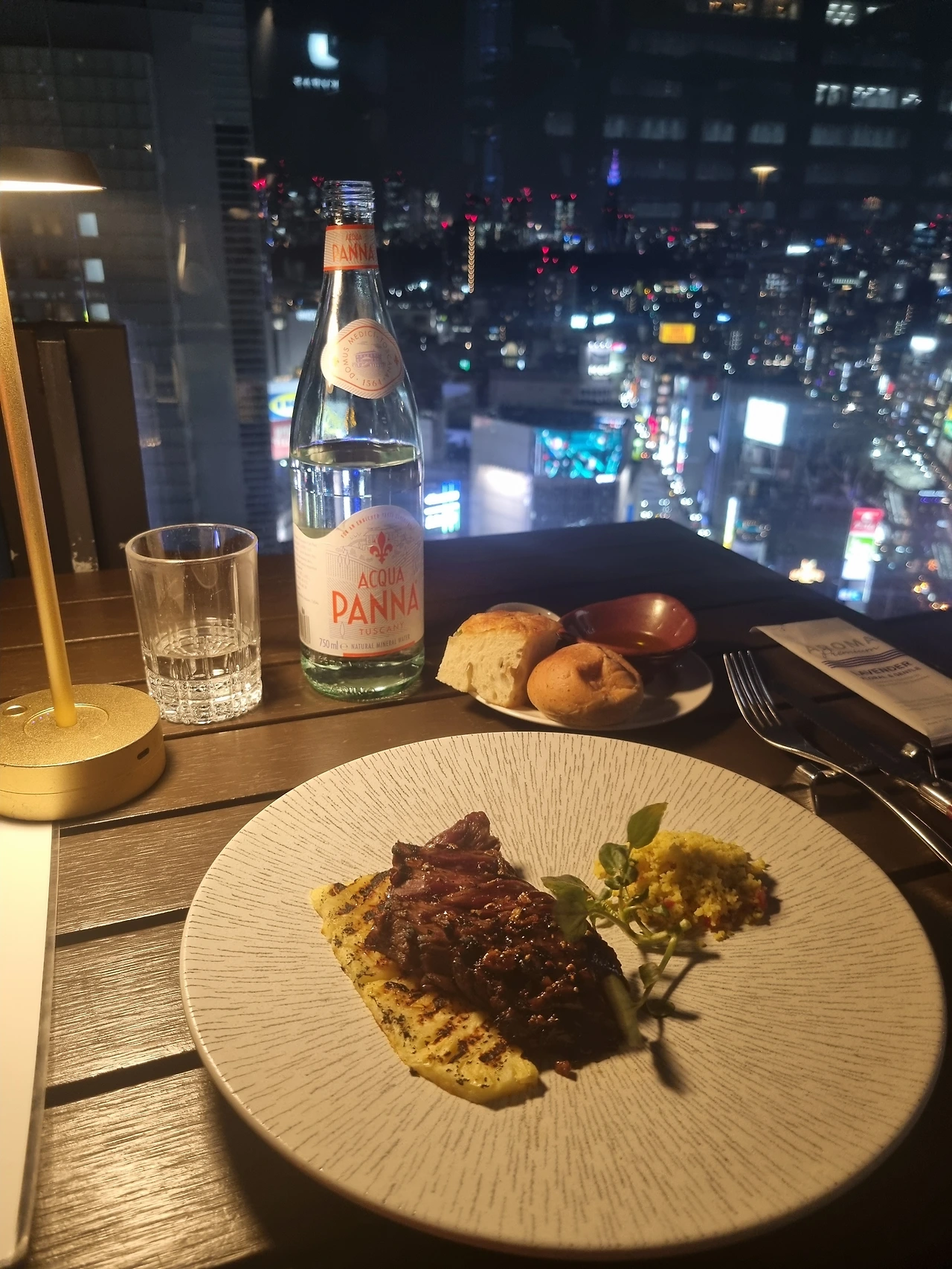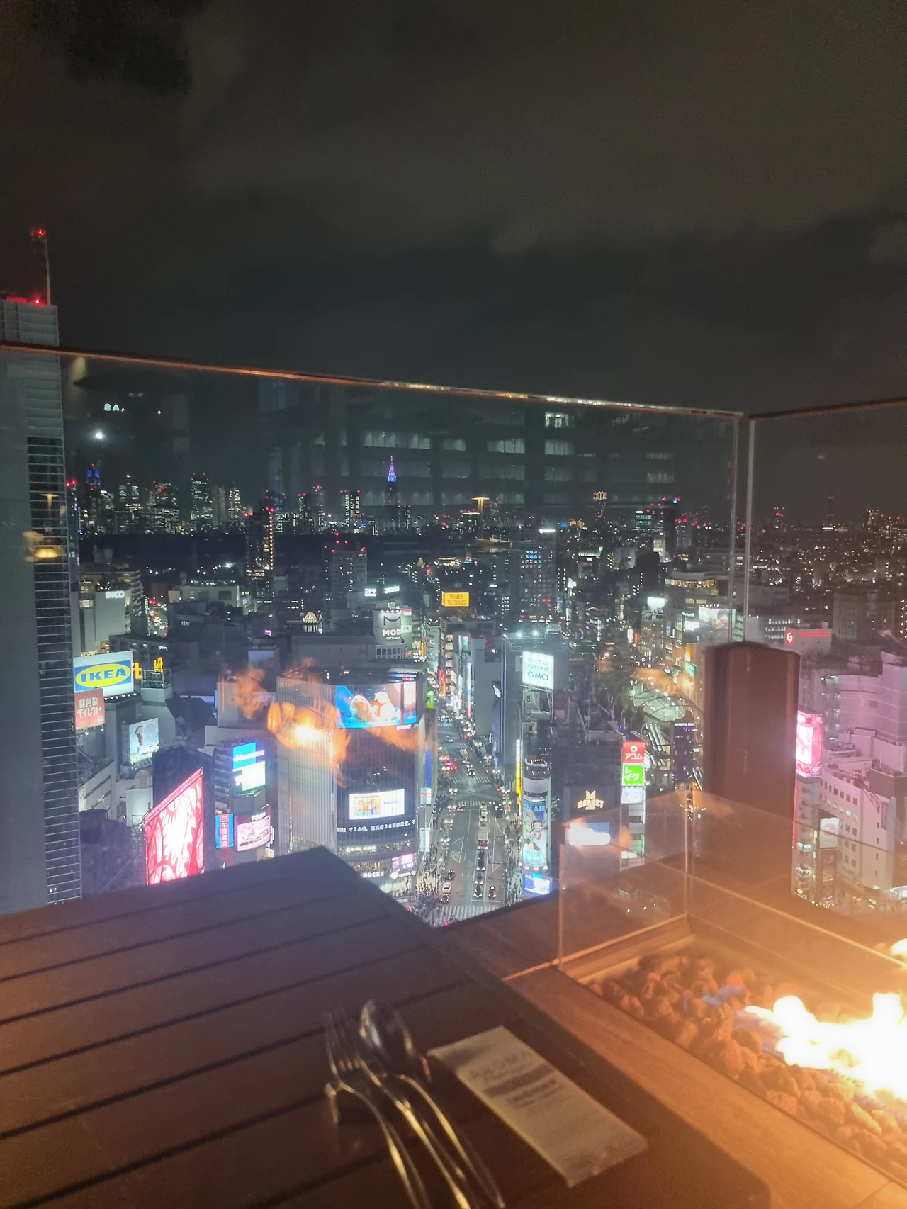 뷰는 아주 만족스러웠다. 교차로가 바로 정면으로 보이고, 스크램블 스퀘어가 좌측에 있는 좌석으로 안내해 주셨다. 다만 내 영어 스피킹 실력이 완전 죽었다는 것에서 충격을 좀 받았다. 한 4년 정도 안 쓰다 보니까 머릿속으로는 문장이 완성되는데 내뱉어지지가 않았다.. 아마 처음 와보는 초고급 식당이라 긴장해서 그럴 수도. 날씨가 쌀쌀했는데, 고층이라 그런가 칼바람이 무지 불었다. 내 양옆으로 불을 피워주셨는데, 거의 열 번 가량 꺼져서 직원분도 포기! 를 하셨다. 진짜 추웠다.