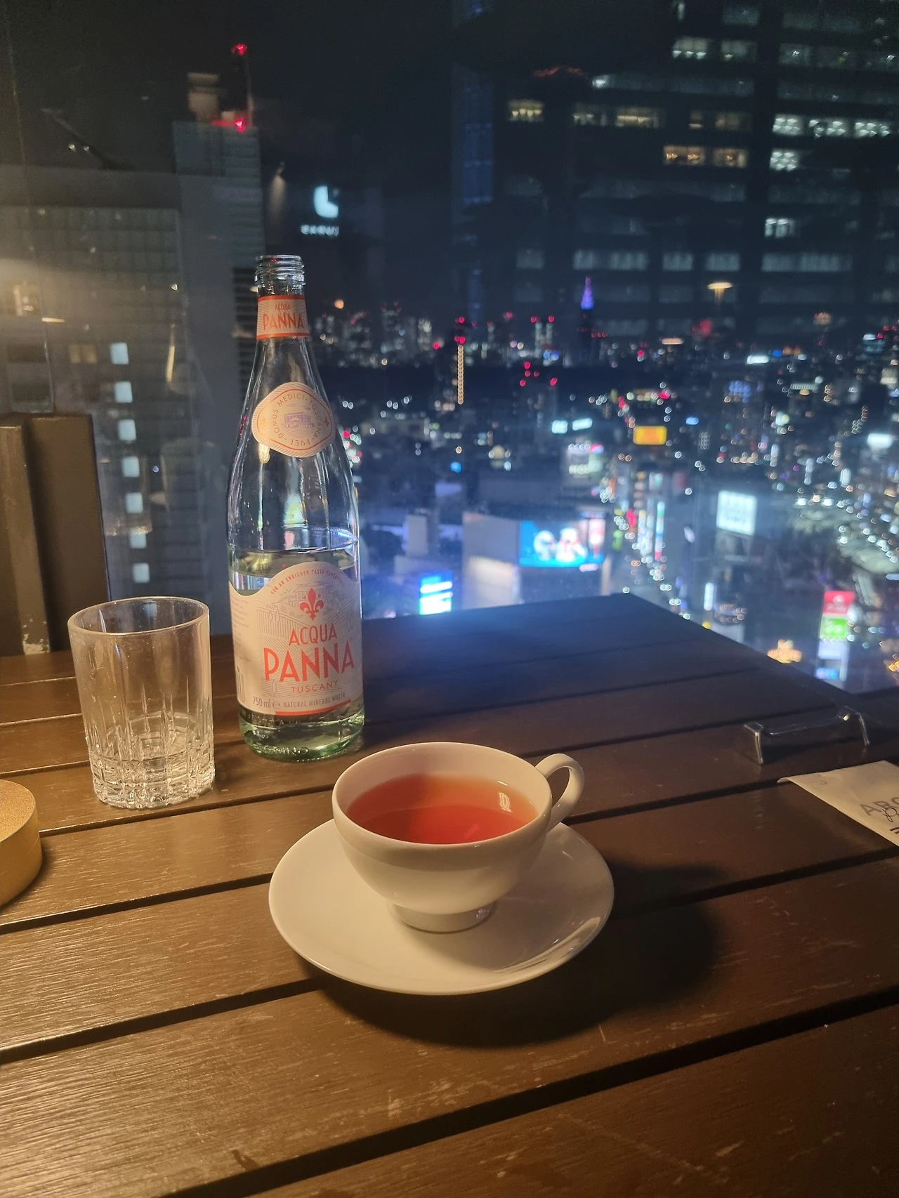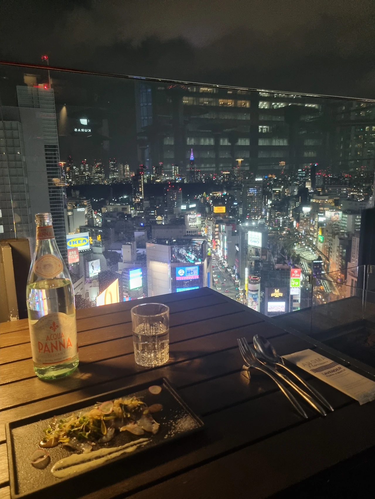 너무 날씨가 추워서 제공받은 담요로 무릎을 감싸고(담요단체험) 벌벌 떨면서 유리창 바로 건너 있는 시부야의 야경을 마주하며 Tokyo Flash 를 1시간 반복 재생해두고 반색을 겸한 여유를 즐겼다. 참 분주하더라. 결제도 알아서 카운터분이 내 자리로 오셨다. 1만엔 조금 더 나오겠지 싶었는데, 1천 엔 이상 쓰면 바깥 자리로 안내해주신다고 하길래 난 당연히 음식을 그 정도 시키면 바깥 자리로 배정받을 수 있는줄(당연히 그럴 일이 없다) 알았다.. 그리고 물 두개 중에 선택하라고 하길래 미네랄 워터로 골랐는데 이것도 1300엔을 내더라? 그래서 거의 15000엔 가까이 냈다. 한 명 식사하는데 15만원을 태우다니.. 그치만 정말 만족스러웠다. 너무 추운 날씨를 빼면, 시부야 교차로가 보이는 건물 옥상 야외에서 코스 요리를 즐기며 바라보는 야경이란 참 만족스러웠다.