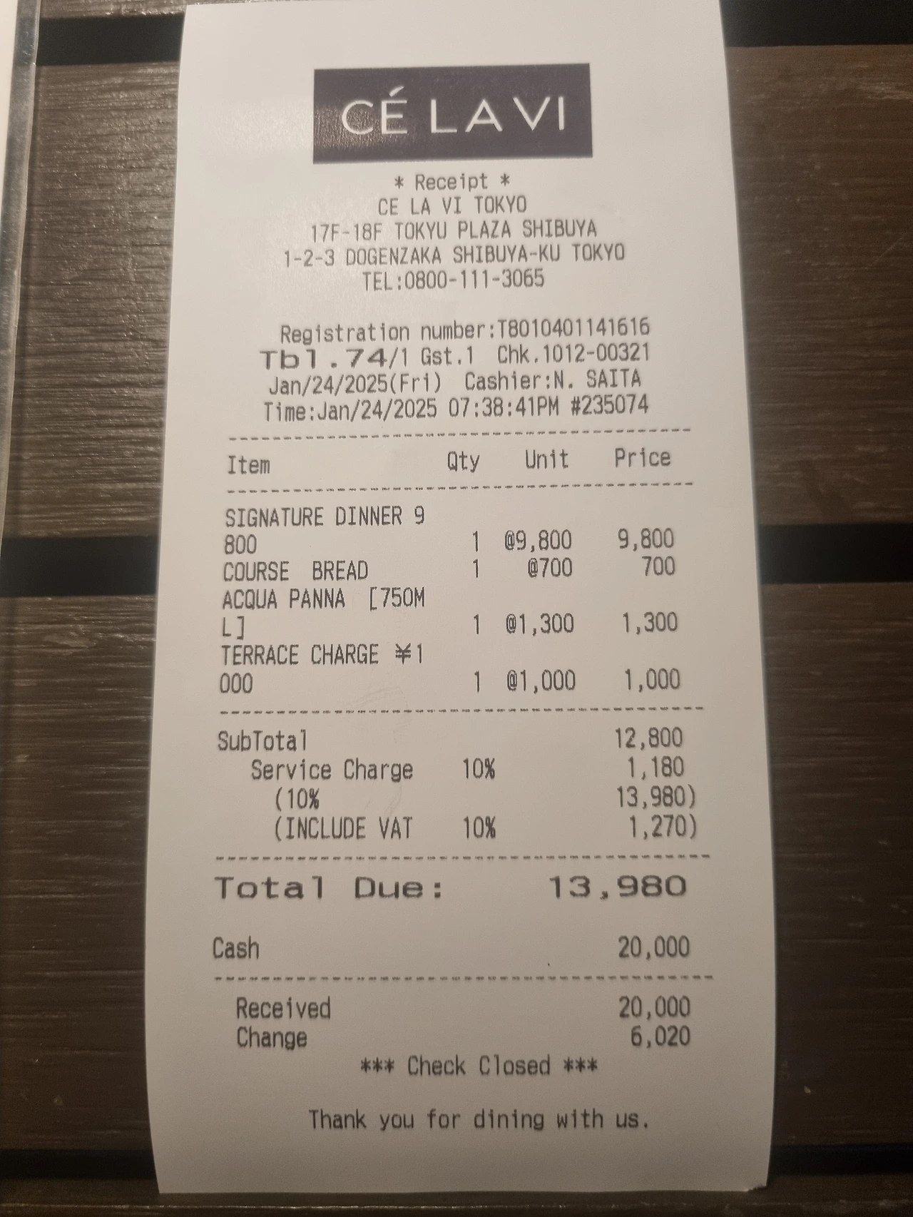 그래서 링크 세 번째에 있는 시부 니와로 향했다. 여기에서도 좀 헤맸는데, 전망대가 있다고 했는데 경비원분에게 물어봤는데 닫혀 있어서 자기도 잘 모른다고 한다. 세계적인 음식점 CE LA VI가 위치해 있다고 해서 여기서 식사를 해보려 했는데, 뭔가 입장하기 위한 진입 장벽이 좀 심했다. 근데 이 건물 제일 꼭대기 두 층을 돌아다녀 봤는데 전망대가 딱히 없던데? 여기서 식사를 하면 야경을 볼 수 있을 것 같아서 들어갔다. 원래는 여기에서 야경을 어떻게 보는 건지 프론트분에게 질문하던 놈이 갑자기 여기서 코스 요리로 혼자 식사를 하겠다니, 태세 전환이 상당하다 나.