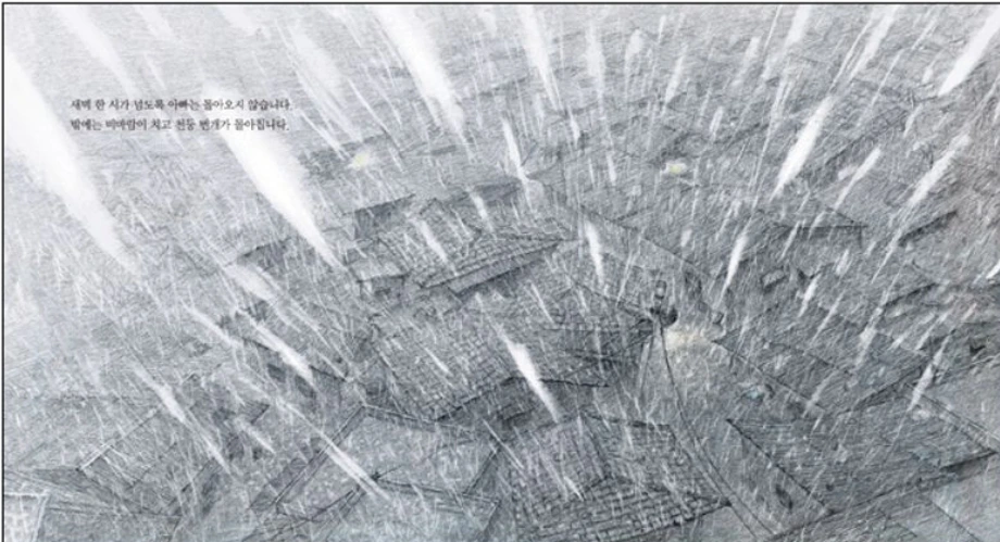 아빠는 한 손으로 우산을 꼭 잡고 있습니다…