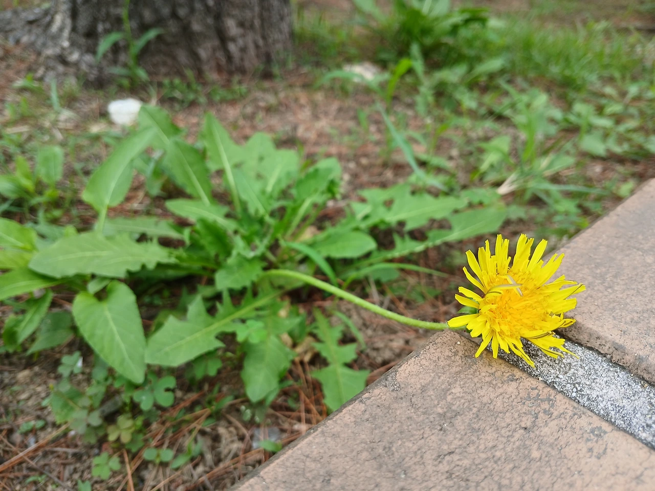 보도블록을 기대고 있는 민들레가 눈에 띄었다.