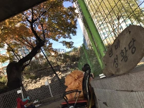 언덕을 내려 굴다리 지나면 한강이다. 이쪽엔 고수부지가 좁다. 자전거 도로와 농구장 하나가 겨우 있다. 거기에 옆으로 뻗은 가지 하나를 겨우 버티고 서 있는 느티나무가 있다. 수령 500년. 민비 성황당이다. 정성 들이고 있는 분들이 보였다. 여기서 굿도 한다. 소음으로 민원이 많자 징은 안 쓴다고 한다.
