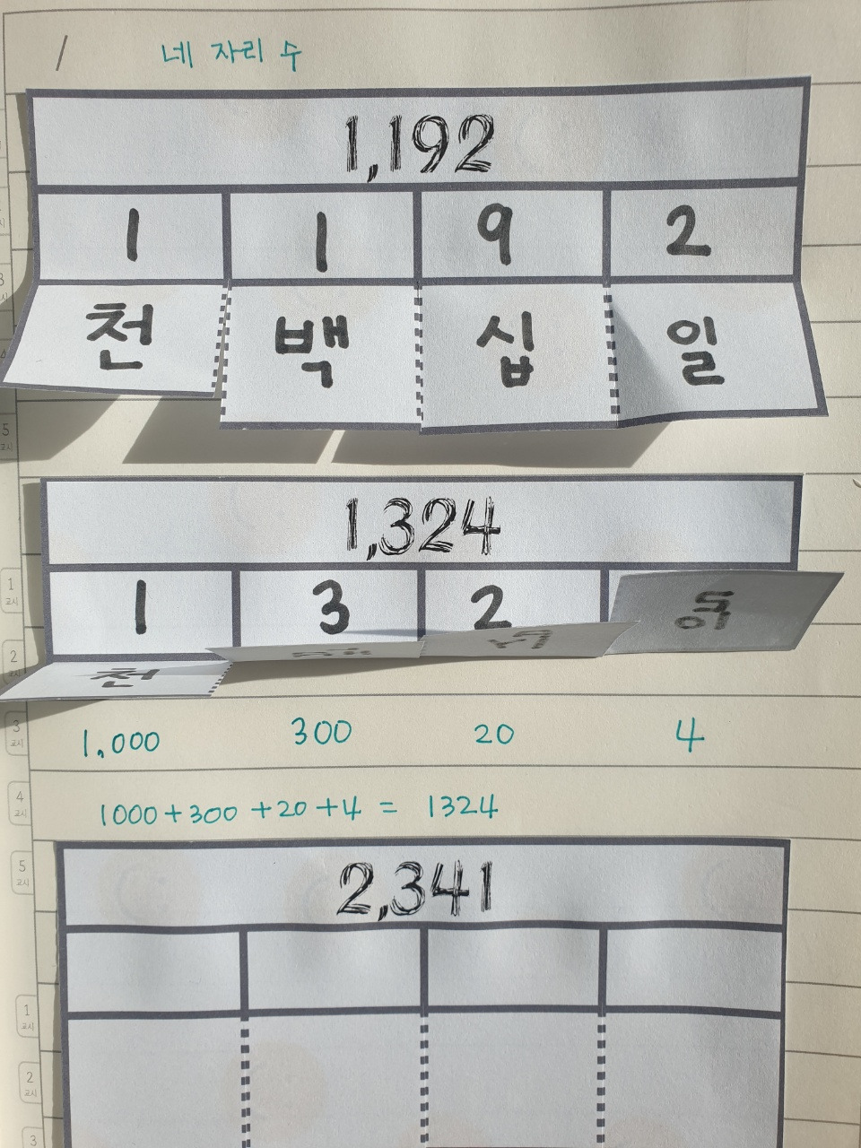 각 자릿값을 익히며 천, 백, 십, 일을 적기