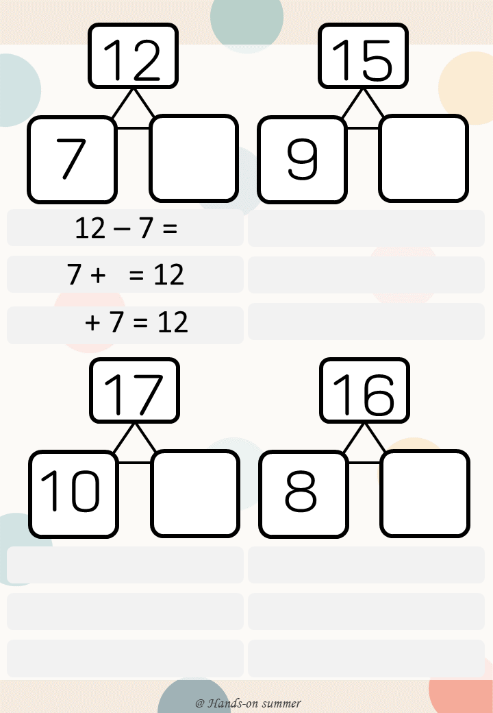 빈 칸을 채우고 관련있는 덧셈과 뺄셈식 적기