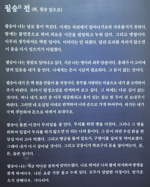 "필승아 나는 지금 막다른 골목에 맞닥뜨렸다. 나로 하여금 너의 팔에 의지하여 광명을 찾게 하여다우. 나는 요즘 가끔 울고 누워 있다. 모두가 답답한 사정이다. 반가운 소식 전해다우. 기다리마."