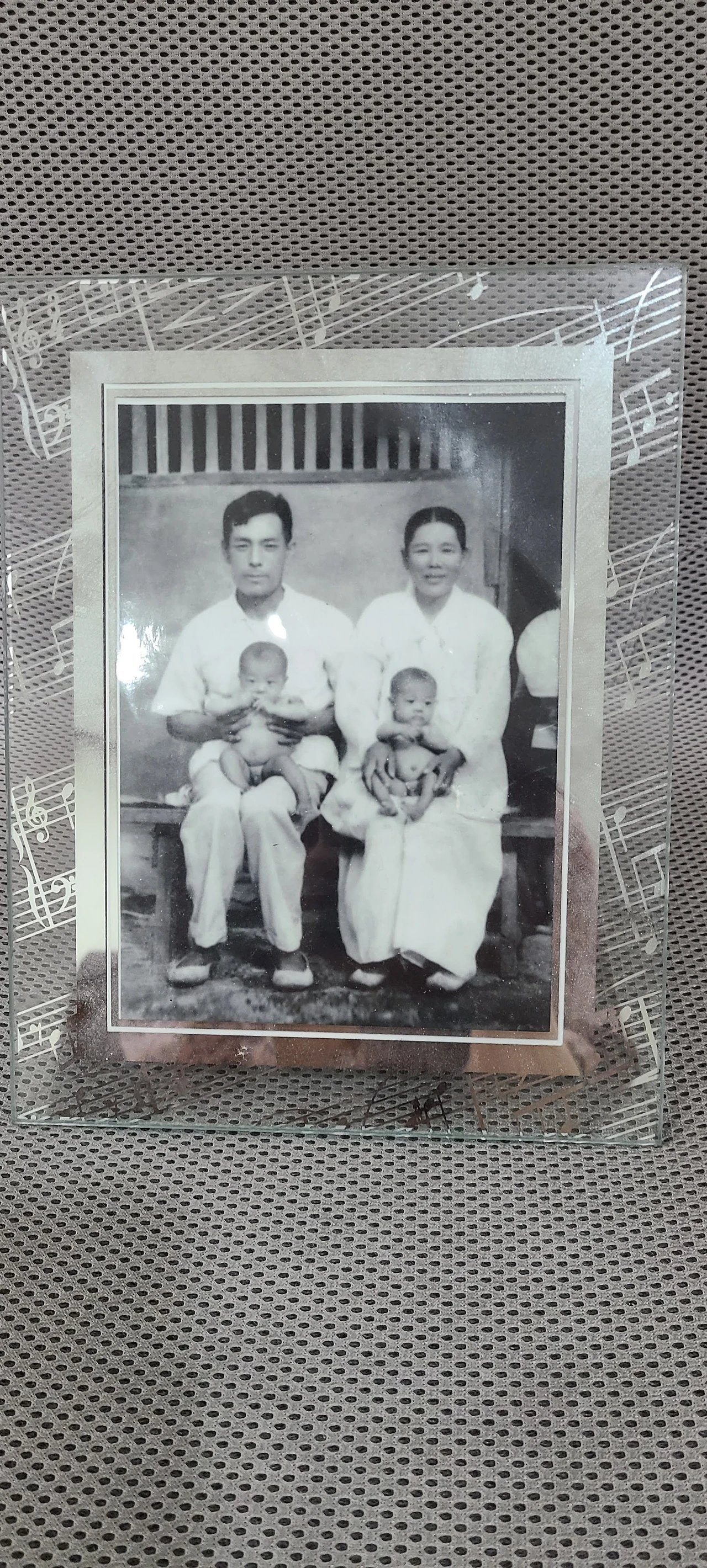 1960년 진주에서 태어난 쌍둥이 외삼촌 상준, 상봉의 어린 시절을 담은 귀한 가족사진이다. 사진 속 외조부모님은 정갈한 옷차림으로 나란히 앉아 두 아기를 품에 안고 있다. 외할아버지는 단정한 흰 셔츠에 긴 바지를 입고, 발에는 고무신을 신은 채 단단하고도 온화한 표정을 짓고 있다. 외할머니는 흰 저고리와 통치마 차림으로 같은 고무신을 신고 있으며, 품 안의 아기를 감싸 안은 손끝이 유난히 다정하다. 두 분의 얼굴에는 시대의 고단함 속에서도 자식에 대한 사랑과 책임감이 묻어난다. 바닥에 닿은 고무신 한 켤레 한 켤레가 그 시절의 검소함과 성실한 삶을 말해주는 듯하다. 흑백 사진 속의 배경은 단출하지만, 그 안에 담긴 가족의 온기와 생의 흔적은 선명하다. 지금은 외조부모님 두 분 모두 고인이 되셨지만, 이 사진 한 장은 그 시절의 숨결과 사랑을 고스란히 품은 채 우리 곁에 남아 세대를 잇는 기억으로 빛나고 있다.