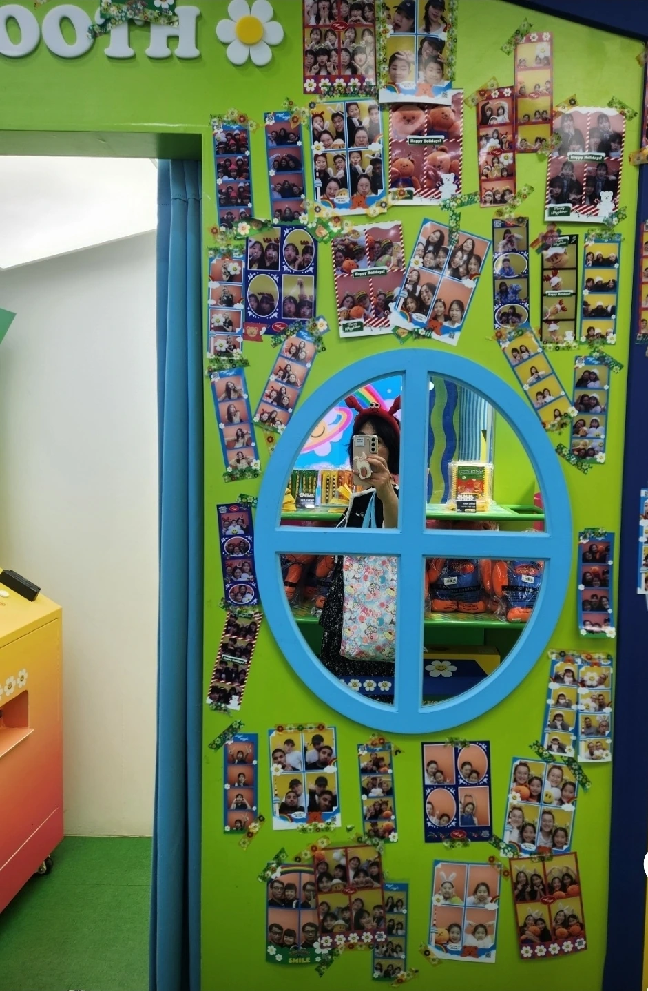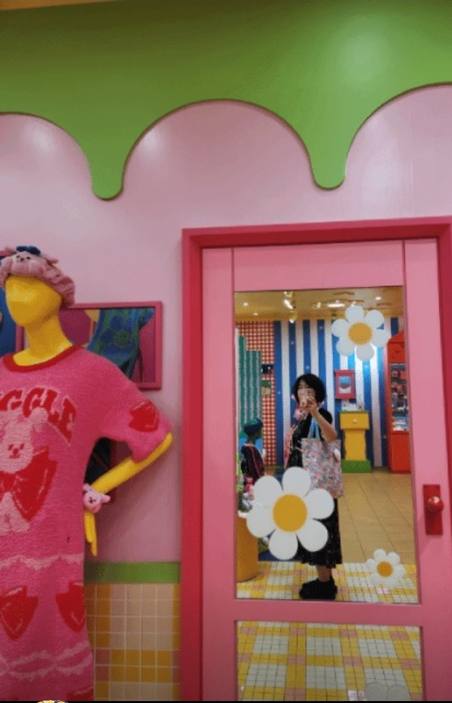 쇼핑몰 1층, 2층, 3층을 오르내리며 거울 앞에서 혼자 사진을 찍는다.