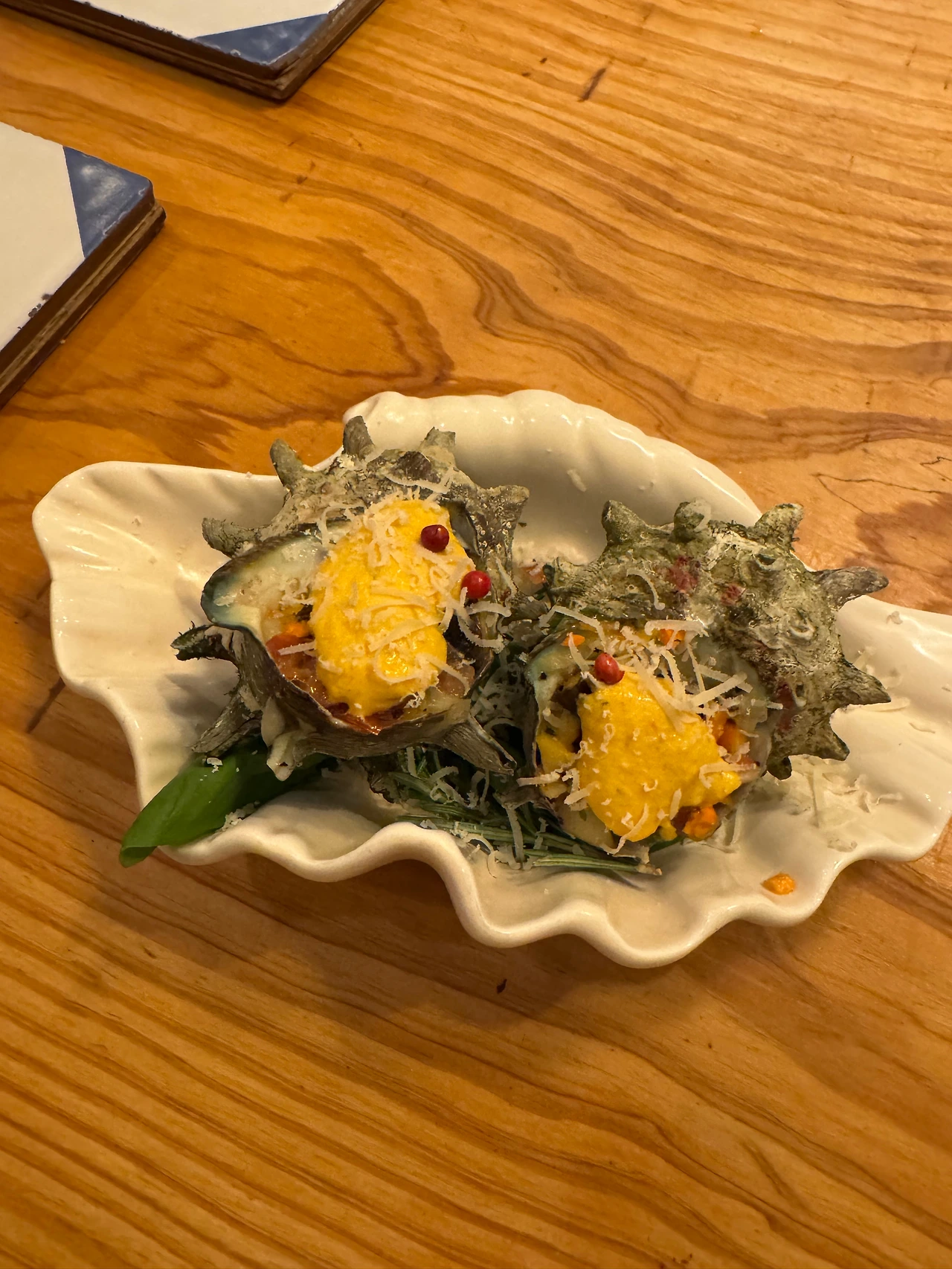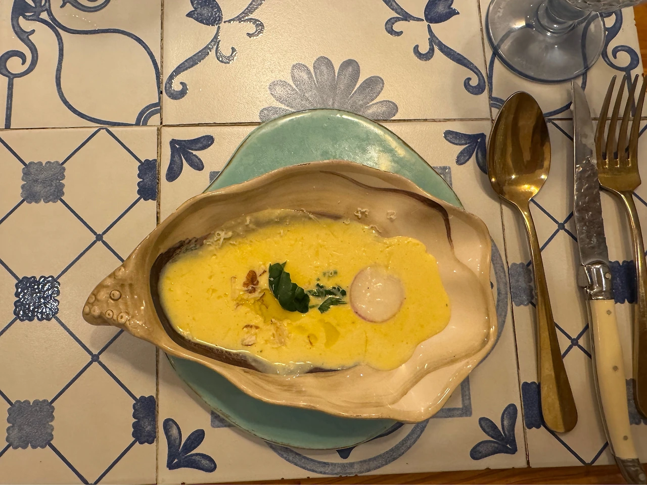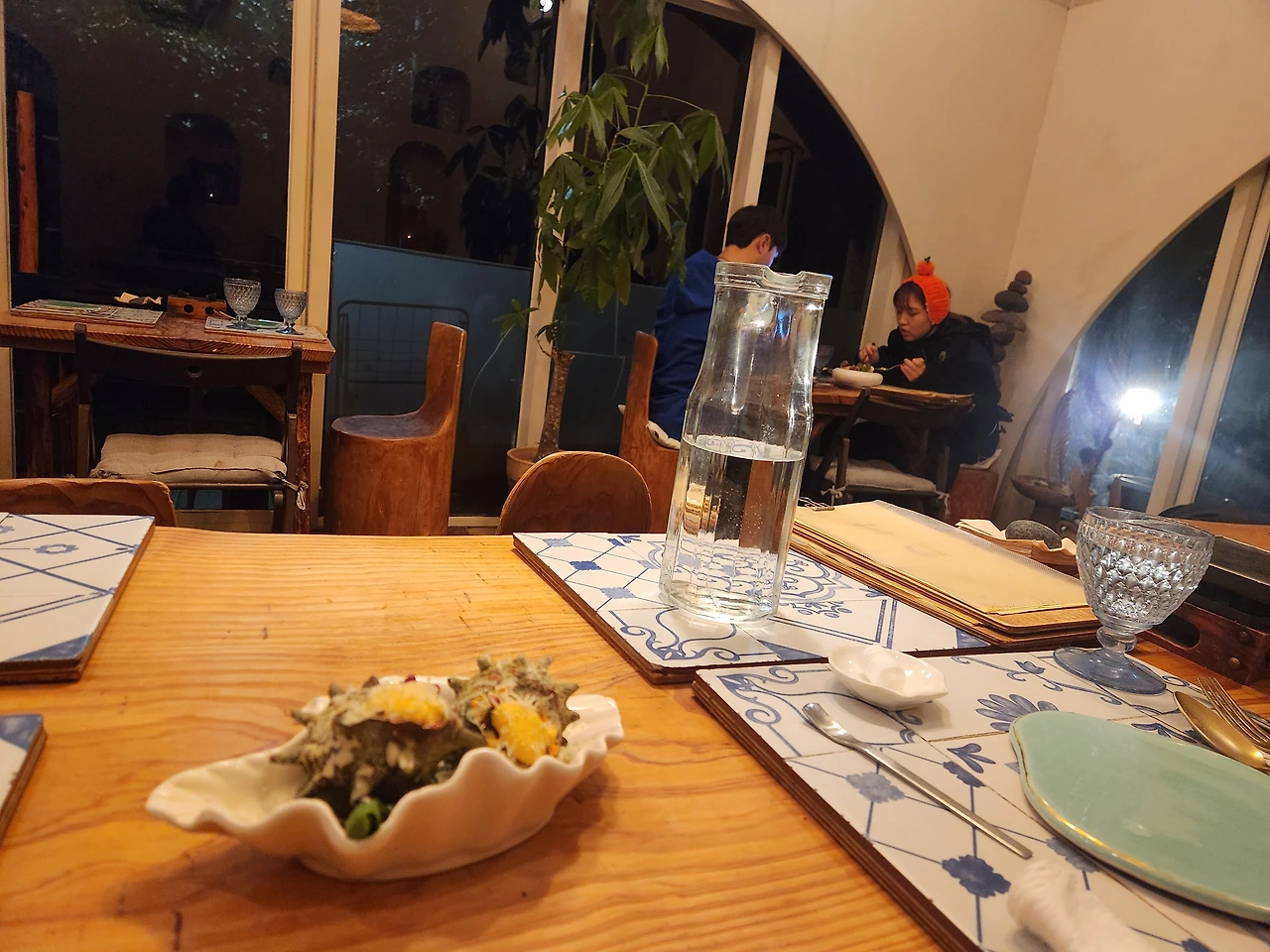 두 번째로 나온 요리는 제주에서도, 그리스에서도 쉽게 만날 수 없는 독특한 요리였다. 바다의 기운을 그대로 품은 소라 껍데기 속에 치즈와 소스가 폭신하게 녹아들어 있었다. 살짝 구운 향이 코끝을 간질였고, 치즈 위에 올려진 고운 가루는 바람처럼 가벼웠다.