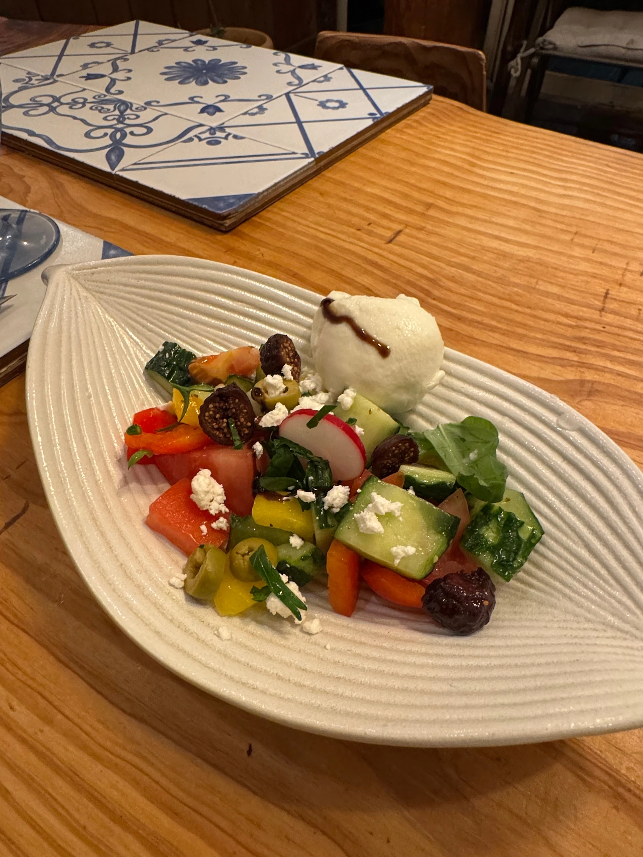우리가 주문한 첫 번째 요리는 지중해의 공기를 그대로 품은 듯한 샐러드였다. 곡선으로 흐르는 흰 접시 위에 토마토, 오이, 라디시, 올리브, 그리고 작은 보석처럼 박힌 말린 무화과가 올려져 있었다. 그 위에 뿌려진 치즈는 눈처럼 가볍게 흩어져 있었고, 한쪽에 놓인 부드러운 치즈 한 스푼은 제주 바람을 타고 이곳까지 흘러온 것처럼 신선했다.