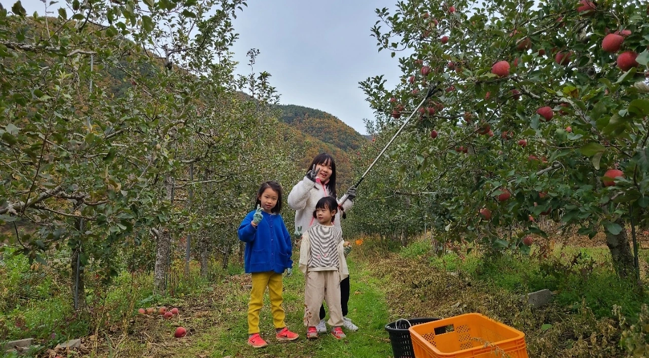 사돈네와 친척들은 나무마다 열린 사과를 따고...