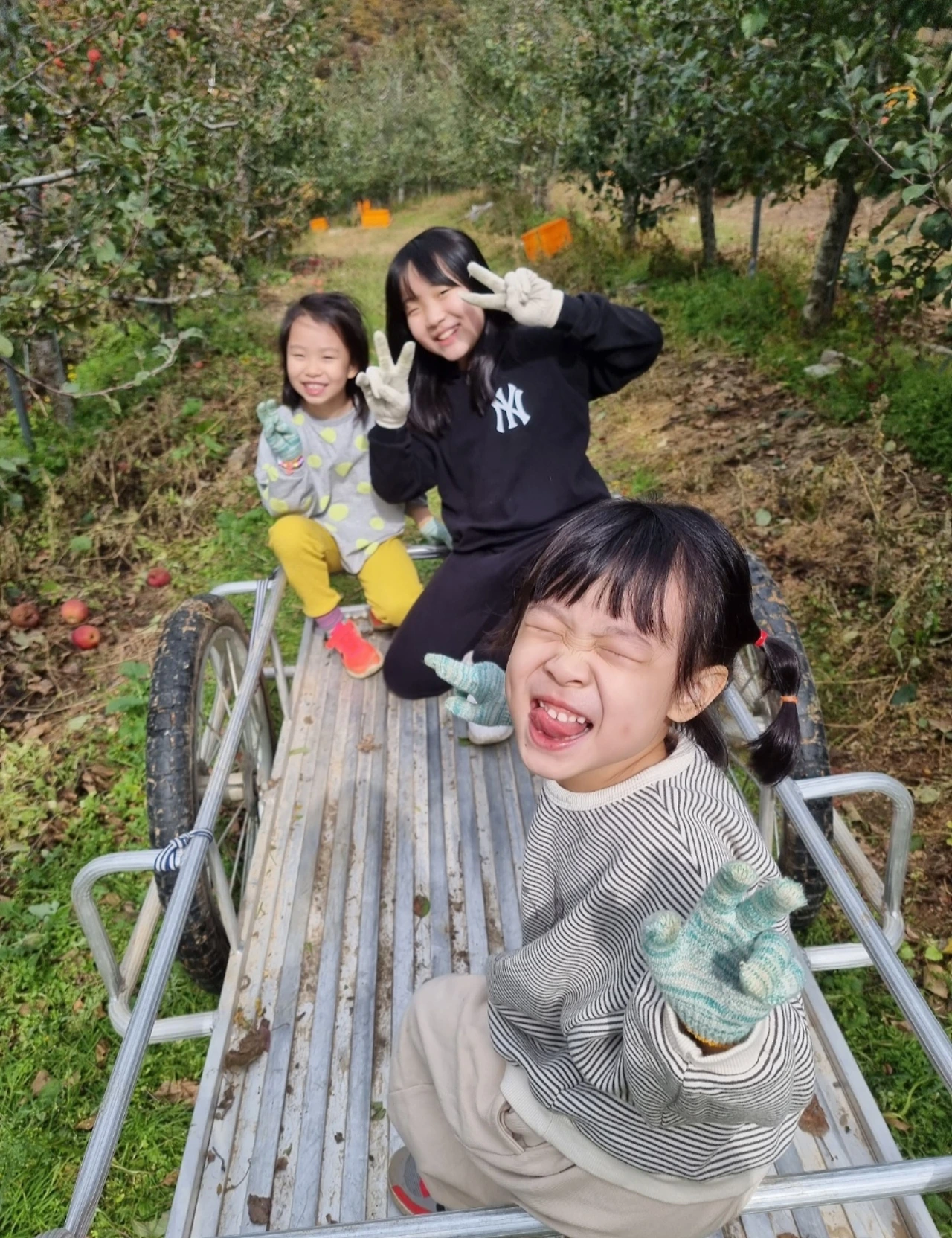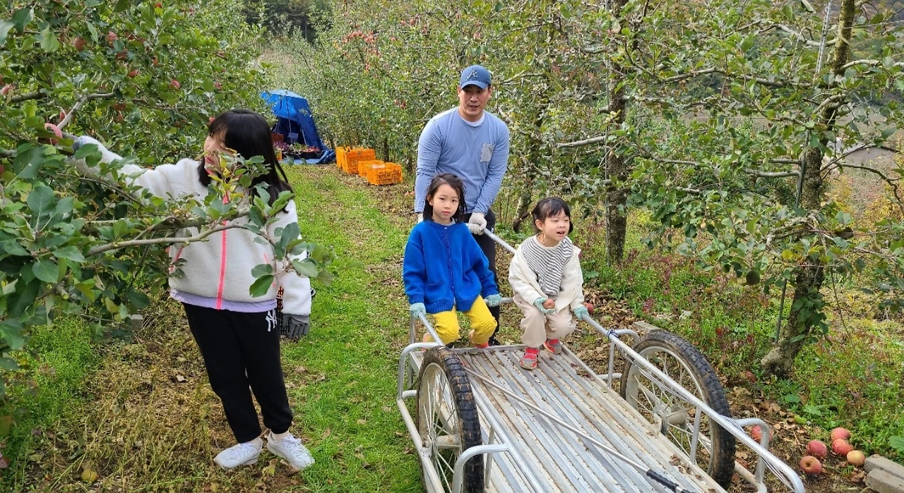 자식들은 바구니마다 가득 딴 사과를 실어 나르고,