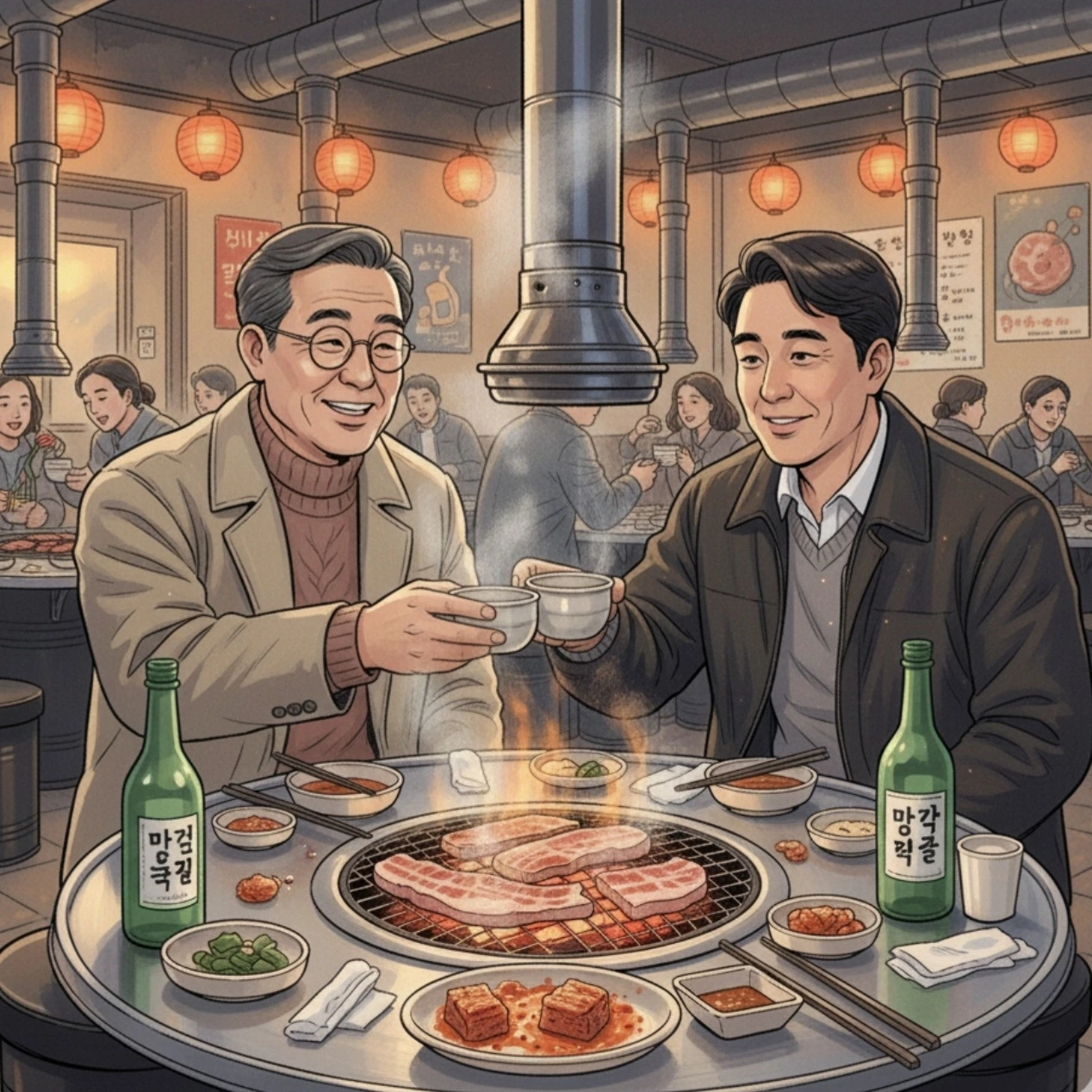 "실내 고깃집에서 60대 안경 쓴 선배님과 40대 후배의 막걸리 한잔"의 삽화를 요청했더니...