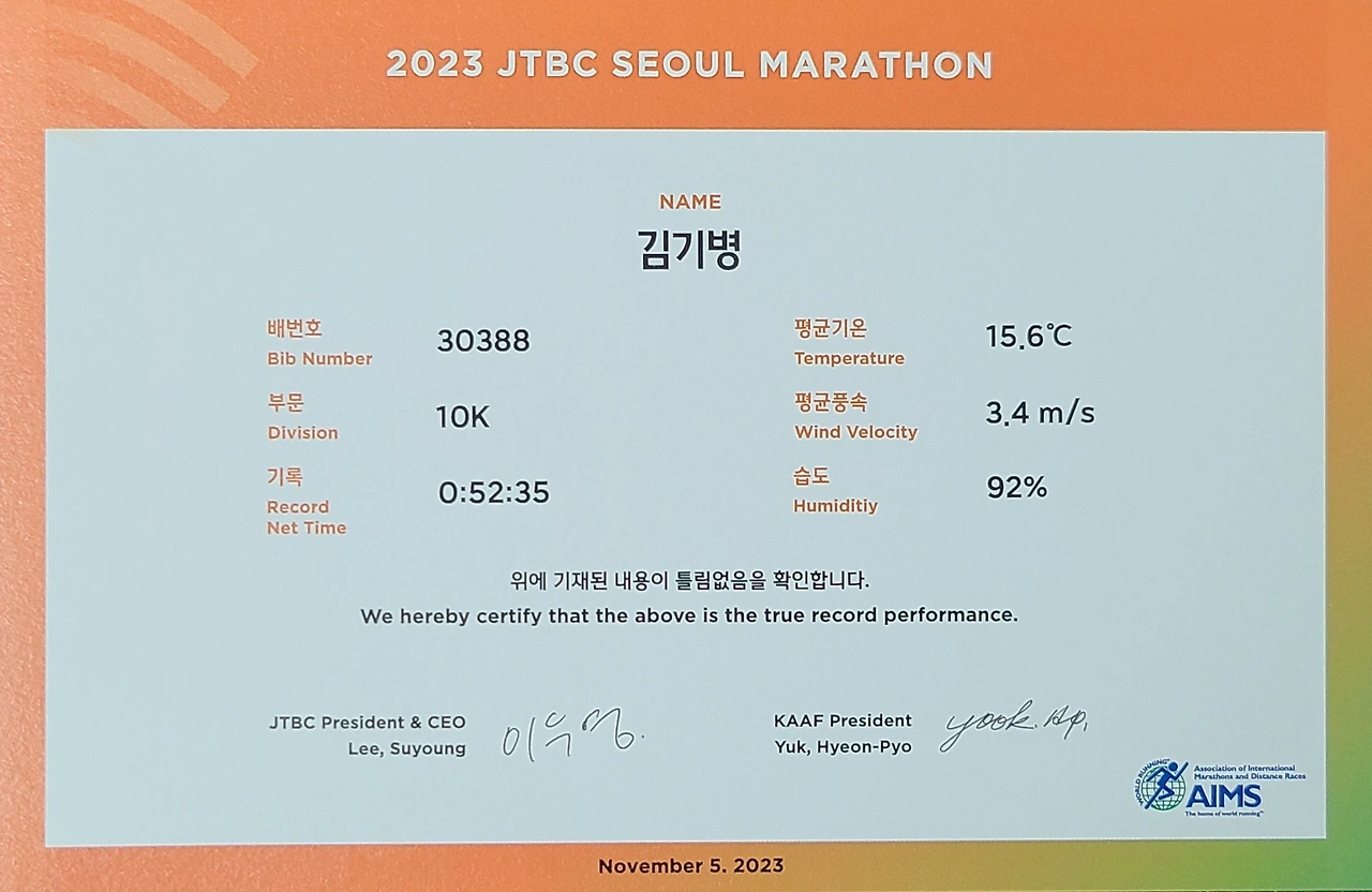 - 3대 마라톤 대회 중 하나, 서울마라톤에서 10K 최고 기록!