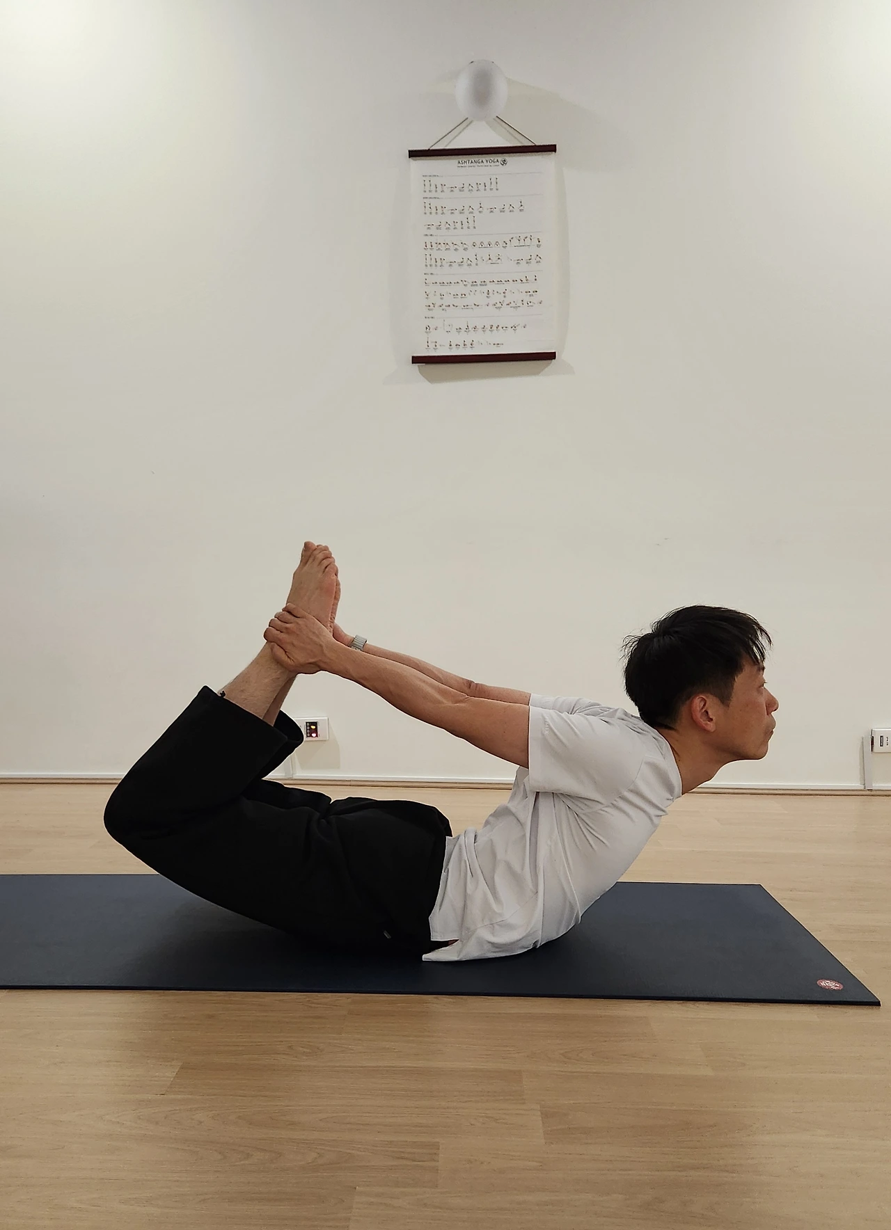 이얏~ 변형된 살라바아사나 [메뚜기 자세]!