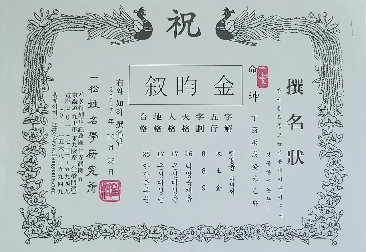 역시 용하다는 곳에서 좋은 이름을 지었다.