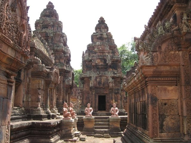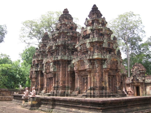 13시 15분. 반데이스레이 사원에 도착! 이 사원은 다른 앙코르 유적지와는 달리 건축술과 장식이 인도 문화에 매우 가깝다고 한다. 특히 붉은색의 사암을 이용한 정교한 조각품은 크메르 예술의 극치라는 표현이 아깝지 않을 정도이며 규모는 작지만 보석에 비유될 정도로 가장 아름답고 정교한 사원으로 알려져 있는 곳이 바로 이곳 반데이스레이 사원이다. 음각과 양각의 깊이가 매우 뛰어나고 코끼리의 주름까지 세밀하게 표현을 했으니, 앙코르와트의 웅장함 및 회색톤 색조와는 대비가 많이 된다. 붉은색 사암에 에메랄드 빛 이끼는 세월의 깊이를 다시금 느끼게 해 주는데 오후가 되어 날씨가 더워지니 땀도 많이 나고 이거 이러다가 이 유서 깊은 사원에서 쓰러지는 게 아닌가 할 정도로 햇살이 강렬하다^^;