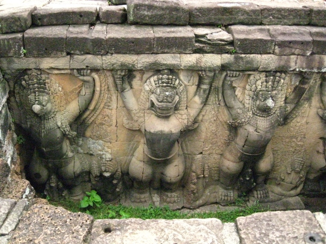 13시 35분. “거대한 도시”라는 어원을 품고 있는 크메르시대 최고의 도읍지인 앙코르 톰으로 들어가는 남문을 지나면 드디어 신들의 세계로 들어선다. 해자에 걸린 다리의 난간에는 유해교반의 신화를 모티브로, 신들과 아수라가 좌우 각각 54명씩 서서 큰 뱀의 몸을 안고 마치 줄다리기를 하는 모습이 묘사되어 있는데 목이 없거나 훼손된 부분이 많아 안타깝다. 앙코르 톰은 왕코르와트와 함께 앙코르 문화의 쌍벽을 이루는 곳으로 한 변이 3km의 정사각형 모양이며 높이 8m의 성벽과 너비 11m의 해자로 둘러싸여 있다. 유적지에 진입하니 매우 큰 나무가 시원한 그늘과 청량한 공기를 제공해 매우 상쾌한 기분을 느낀 수 있으며 짙녹색의 대자연이 보여주는 풍경과 웅장한 고대 사원이 조화를 이루는 모습을 앙코르와트에서처럼 다시 한번 느낄 수 있다. 그 옛날 군대의 사열식이나 왕의 집무실로 쓰였다는 중후한 코끼리테라스부터 본격적인 앙코르 톰 관람이 시작된다. 돌에서 피어난 이끼는 긴 세월의 흔적을 보여주며 코끼리테라스 북쪽에 있는 라이 왕 테라스에 이르면 왕 전용 화장터를 볼 수 있다. 캄보디아는 매장이 없는 화장 문화인데, 이렇게 왕 한 명을 위한 거대 화장터는 당시 신격화된 왕의 무한한 힘을 엿볼 수 있는 듯하다.