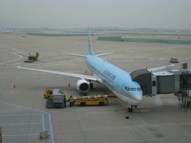 19시 05분. 드디어 출국! 나의 조국이여... 내 잠시 자리를 비움을 섭섭하게 생각하지 말아 다오. 해외 나가면 다 애국자가 된다더니 잠시나마 우리나라를 떠난다니 시원섭섭(?)한 느낌이 살짝 든다. 창가 자리라 활주로를 떠나며 보이는 창밖 경치가 시원하다. 바로 옆으로 보이는 비행기 날개가 무지 크고, 활주로도 아주 넓다. 오리엔트타이 항공이나 아시아나 항공에 비해 처음 타본 대한항공은 쿠션과 담요, 헤드셋도 잘 갖추어져 있고, 좌석 사이 간격도 제일 넓어 왠지 편안한 느낌이 든다. 같은 곳으로 향하는 사람들의 표정에서 설렘과 기대감이 함께 느껴지니 덩달아 기분이 좋아진다.