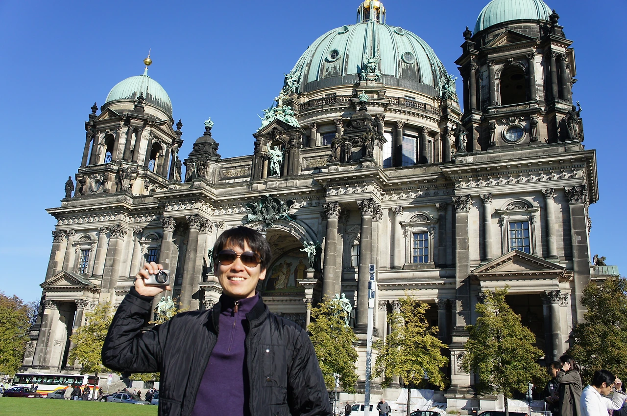 12:55 높이가 무려 114m나 된다는 베를린 대성당에 도착! 돔형의 에메랄드빛 지붕, 황금색 십자가, 세월의 흔적을 보여주는 회색 및 검은색의 기둥 등 고전미가 물씬 묻어나는 웅장한 성당이 유유히 흘러가는 강 사이로 서있는 풍경이 장관이다. 대성당의 건축미에 빠진 것도 잠시 대성당 바로 옆의 독일 구 박물관은 넓은 잔디밭과 시원해 보이는 분수가 잘 어우러진 신전 같은 외관이 아름답다. 잔디밭에 누워 따사로운 햇살을 쬐고 싶지만, 잔디밭에 들어가 있는 사람이 거의 없다. 우리나라 같았으면 너도 나도 잔디밭에 돗자리부터 필 생각을 할 텐데 이렇게 공중도덕을 잘 지키는 점은 우리도 배워야겠다.
