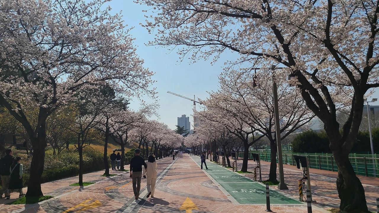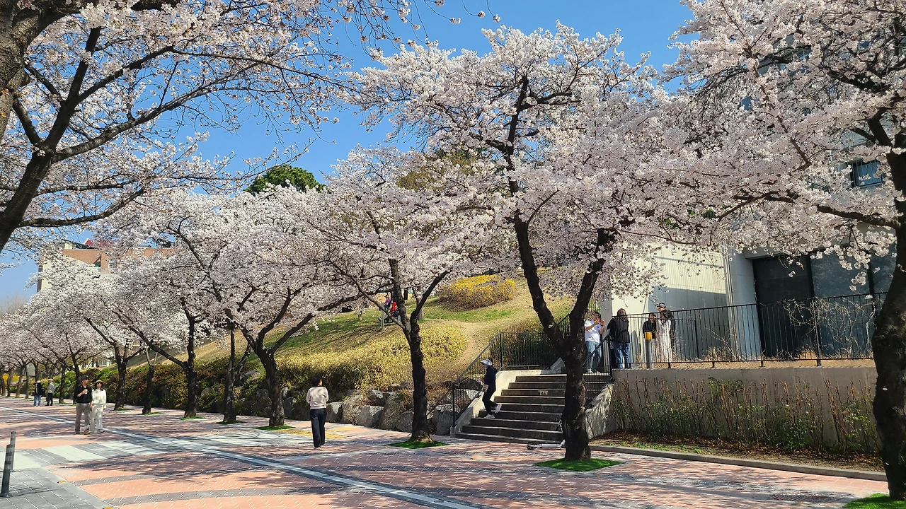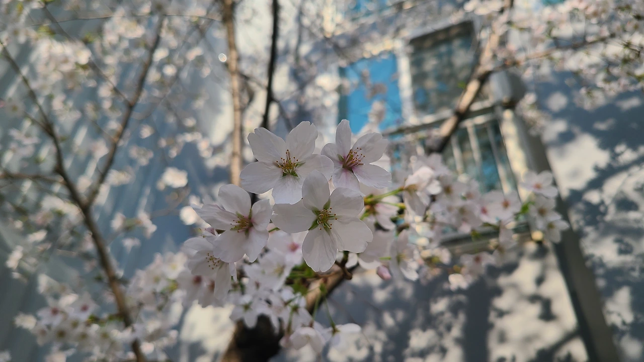 꽃잎을 흩뿌리는 벚꽃나무가 꽤나 잘 어우러진다.