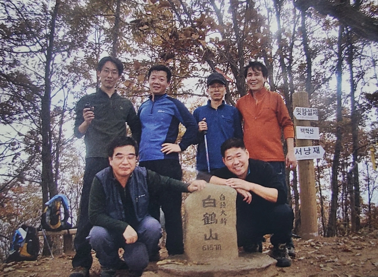 11시 05분. 금일 산행 코스 중 가장 높은 고도인 백학산 정상(615m)에 오른 이 작은 비석과 아담한 벤치, 가을의 정취를 물씬 풍기는 주변 경치가 우리들을 맞는다. 정상 주변 나무엔 어느새 잎사귀가 얼마 남지 않은 게 겨울이 금세 찾아올 듯하다. 낮은 고도인 만큼 도로와 마을이 한눈에 보이고 그만큼 아기자기한 풍경을 느끼며 다시금 내려가는 길이 이어진다.