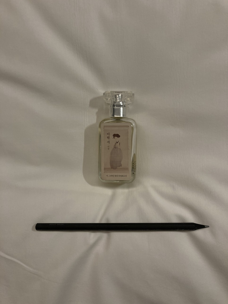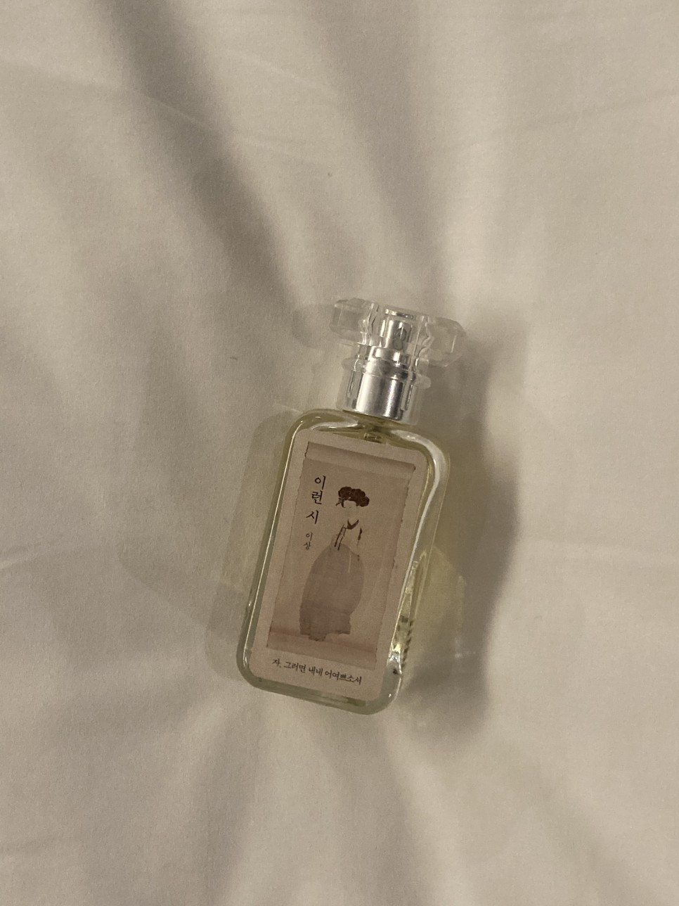 용기에 담긴 이런 시 북퍼퓸의 첫인상은 '맑다'였다. 시간이 지나며 용액의 색이 조금 변했지만 처음 구매했을 때의 색은 투명하면서도 은은한 베이지 느낌이 물씬 나는 청초한 빛이었다. 청초한 그 빛깔답게 향도 라벨에 그려진 미인도의 미인처럼 수수하고 부드러운 느낌의 향이다.