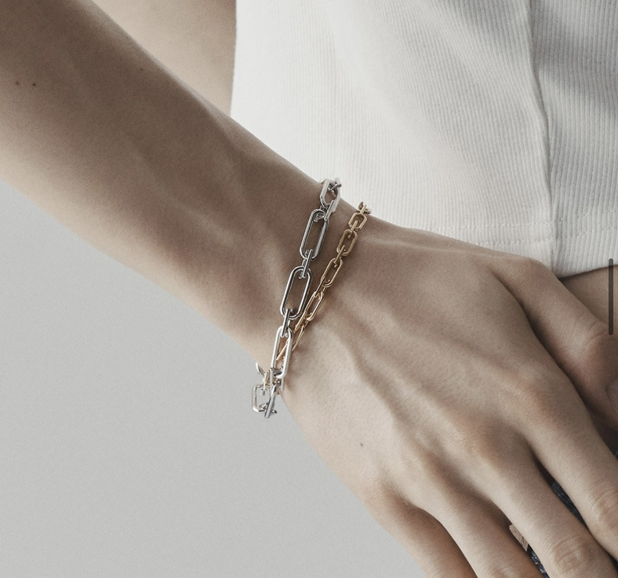 또한 이에르로르는 남녀에 구애받지 않는 젠더리스 주얼리들이 다수 존재한다. 앞서 말한 모든 누군가에 성별과 연령이 포함된다는 점이 브랜드가 가진 가장 큰 장점이다. 수많은 선택권을 한 브랜드에서 택할 수 있음을 제공하는 주얼리 브랜드이기 때문이다. ’05 HAPPINESS’라인에서는 브랜드에서 가장 우아한 제품들을 볼 수 있고, ’05 H. EDITION’에서 심플한 팔찌들을 볼 수도 있다. 선물로 택했던 팔찌는 ’02 Étrive’ 라인이다. 에트레브 컬렉션은 매듭을 의미하는 두 곡선의 만남을 통해 사랑의 내밀한 감정을 상징하는 라인이다. 골드와 실버가 섞여 무겁지만 가볍고, 가볍지만 무거운 확실한 포인트가 된다.