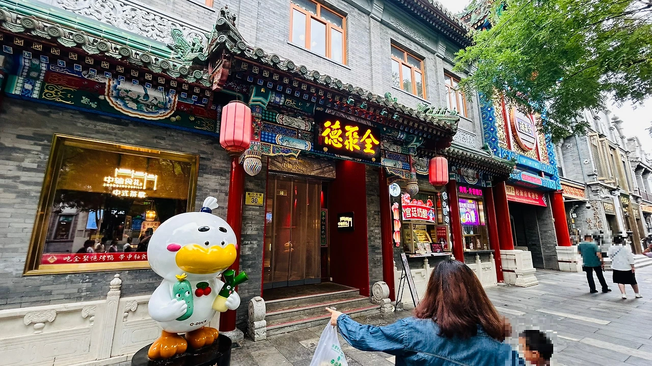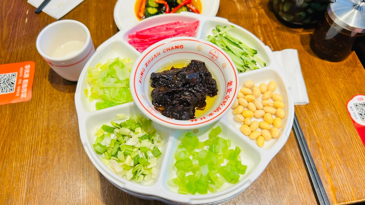 가운데 있는 것이 바로 짜장입니다. 짜장은 마치 구절판 같은 접시에 담겨 나왔고, 다양한 야채가 같이 들어 있습니다. 우리나라의 짜장면은 야채를 짜장에 같이 넣고 끓이거나 볶지만, 베이징의 '짜장미엔'은 이렇게 장과 재료가 따로 준비되어 나옵니다. 대부분 생야채입니다.