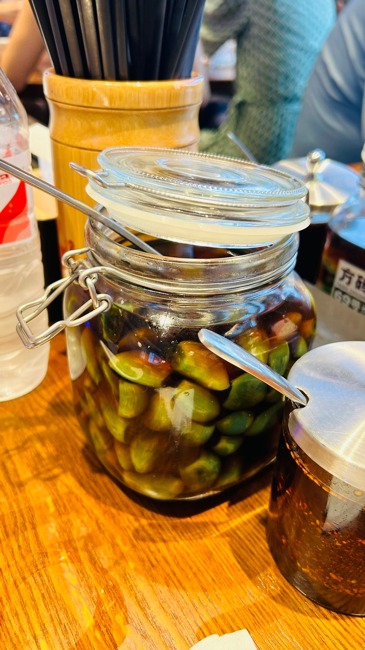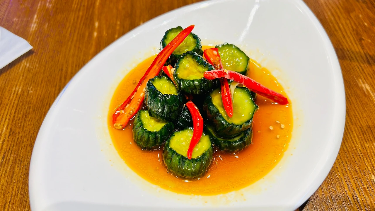 중국 식당에서 주문하면 실패가 없는 오이무침입니다. 무침이라고 하기에는 사실 좀 애매하고, 살짝 말린 것처럼 겉면이 약간 쫄깃해진 오이를 새콤달콤한 간장 양념에 살짝 무치거나 절인 느낌입니다. 참기름 향도 나는데 향신료에 지친 우리나라 사람들 입맛에 제격입니다. 그냥 먹어도 사실 맛있어요. 예전에 타이베이의 딘타이펑에서도 같은 메뉴를 먹은 기억이 있는데요, 실패가 없었습니다. 오른 쪽의 마늘절임은 이 식당의 시그니처라고 하는데요, 절인 마늘에 초록빛이 도는 것이 특징입니다. 아삭하면서도 마늘의 매운 맛이 강하지 않아 마치 피클 집어먹듯 먹기에 제격입니다. 두 반찬 모두 가볍고 상쾌한 맛과 식감을 가지고 있는데요, 짜장면과 먹기에 좋은 조합입니다. 개인적으로 우리나라 중식당에서 주는 노란 단무지는 너무 시고 달아 잘 먹지 않는 편인데, 너무 달지 않고 맛과 향이 살아있다는 점에서 이쪽이 더 마음에 듭니다.