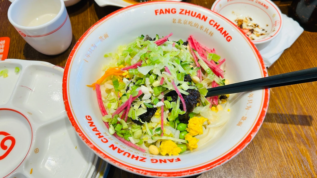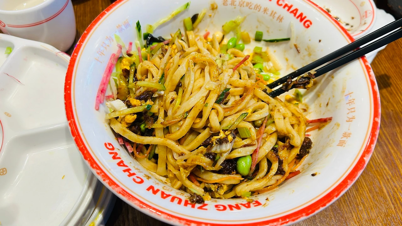 먹는 방법은 아주 단순합니다. 아까 접시에 예쁘게 담겨 있던 재료를 모두 이 면기에 넣고 적당히 비벼 먹으면 됩니다. 장에 물기가 거의 없기 때문에 우리가 생각하는 짜장면보다 훨씬 마른 음식이 됩니다. 어떻게 보면 우리 기준에서는 간짜장과 같은 느낌인데요, 간짜장보다 더 물기가 없다고 보면 될 것 같습니다. 생각해 보면 해외에서 이렇게 생 야채를 먹는 경우를 거의 본 적이 없는 것 같은데요, 특히 어지간한 것은 다 빠르게 볶거나 살짝 데치기라도 하는 중식에서는 처음 보는 것 같습니다. 비주얼도 우리가 생각하는 짜장면과는 많이 다르고, 차라리 고추장을 넣기 전 비빔국수 같은 느낌 아닌가 싶습니다.