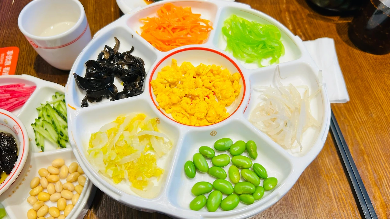 장이 담긴 접시를 들어 올리면, 그 아래에 하나의 접시가 더 있는 것을 볼 수 있습니다. 이 접시에도 다양한 야채들이 들어 있는데요, 정말 우리나라 구절판 같은 느낌입니다. 특이하게 아까 접시까지 해서 모두 두 종류의 콩이 들어간 것을 볼 수 있습니다. 장을 제외하고 13가지 야채가 들어가는데요, 한편으로 보면 비빔밥 같은 느낌이 들기도 합니다.