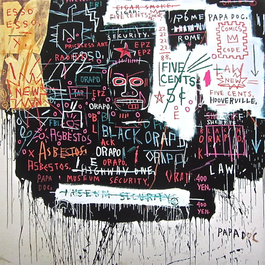 그가 그림에 사용한 단어들은 모두 그를 둘러싸고 있는 시대적 상황과 일상들입니다. 지극히 당연한 일입니다. 자신의 머릿속에서 떠오르는 논제들을 그라피티처럼 가감 없이 자유롭게 휘갈겨 옮겼습니다. 사상의 발현, 발언의 자유. 바스키아는 무의식적으로 혼란으로부터 자유로워지고 싶었는지도 모릅니다. 결국 우리는 그의 말풍선 속 생각꾸러미를 펼쳐 보고 있는 겁니다. 한 사람의 머릿속 생각들이 그림이 되었습니다. 어디서나 자유롭고 당당하고 싶었던 한 젊은 "이".