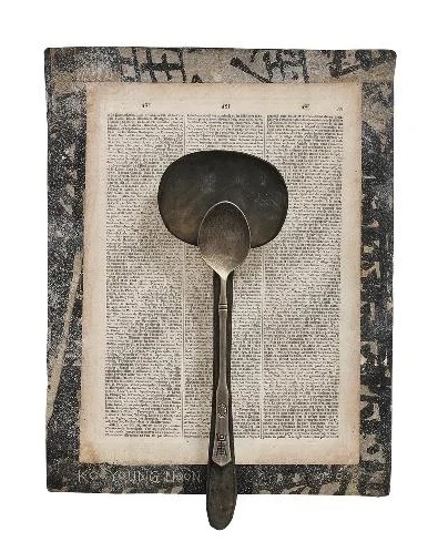 종위에 알 수 없는 사물들이 올려져 있습니다. 돌도 있고, 새도 있고, 스푼도 있네요. 우리는 눈에 보이는 것들이나 혹은 그로부터 떠오르는 생각들을 글로 적습니다. 단순히 눈에 보이기만 했던 사물은 인간의 연상을 통해 종이 위에 글로 변하게 되는 것이죠. 그렇다면 어떤 것이 진짜 존재하는 것일까? 거짓으로 적힌 문자가 아니라면 본질에는 변함이 없습니다. 단지 외형이 바뀌었을 뿐이죠. 그림 속에 사물과 종이는 같은 본질로 다른 형태를 취합니다. 사물과 문자 사이에서 외면과 내면을 넘나드는 차원의 영역에 대해 생각해 봅니다.
