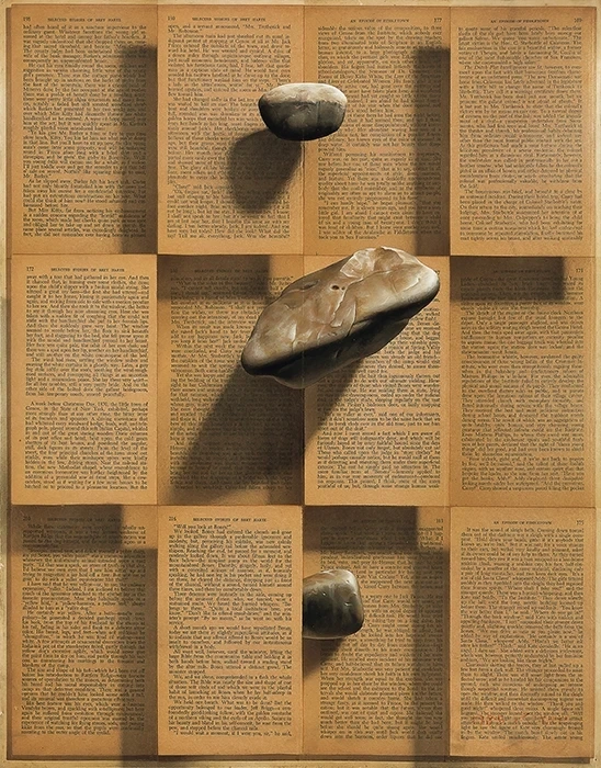 실존하는 현상이나 의식 그 어떤 것이든 기록으로 남겨 책으로 엮는 순간부터 "책"이 됩니다. 그 책은 비로소 무한한 시간을 얻게 되죠. 그 책이 언제 만들어졌든 망가지지 않는 한 천년 후 또는 만년 후 사람들에게도 전달될 수 있게 되니까요. 그림 속에 돌과 사물들은 종이보다 가볍습니다. 그것들은 그렇게 글로 가벼워집니다. 돌이 가지고 있던 시간과 사연은 그렇게 물리적 차원에서 영적 차원으로 전환됩니다.