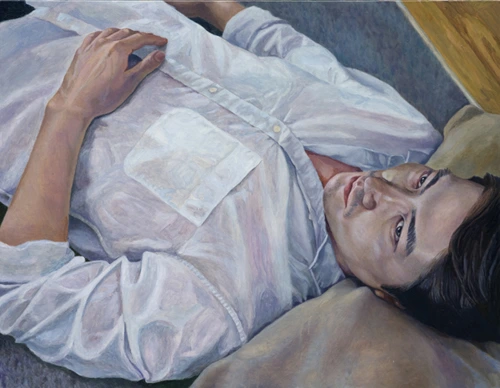 "얇은 외식(外飾)의 장막", 그 한 꺼풀만 벗기면 가려져 있던 내면이 분명하게 드러납니다. 작가의 플래시 라이트는 얼굴 속에 가려져 있던 심상을 비로소 나타나게 합니다. 플래시의 강렬한 찰나, 그 순간을 포착하고 캔버스에 담는 게 서동욱 작가 작품의 핵심입니다. 가려져있던 내면이 드러난 시간은 순간입니다. 서동욱 작가의 그림은 셔터를 누르는 행위라고도 볼 수 있을 것 같아요. 작가의 셔터에 뿜어져 나오는 강렬한 빛은 외식의 장막을 관통해 숨어 있던 고독을 시각화합니다. 저 표정을 보면 어떠신가요? 혹시 자신과 닮아 있지는 않은가요? 작품 속 무기력과 쓸쓸함은 나를 돌아보게 합니다.