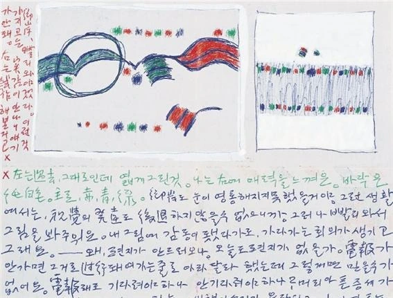 1956년 43세, 수화는 파리로 떠납니다. 김향안 여사가 1년 먼저 파리에 가서 자리를 잡은 후 수화가 그 뒤를 따라가는데요. 김향안 여사는 수화가 현지에 적응할 수 있도록 프랑스어를 공부하고 나중엔 현지에서 동시통역하며 프랑스와 김환기 작가 사이의 가교 역할을 합니다. 믿어주는 마음이 없었다면 어떻게 저렇게 서로 함께 할 수 있었을까 싶습니다. 아래는 수화가 아내에게 보내는 편지들입니다.