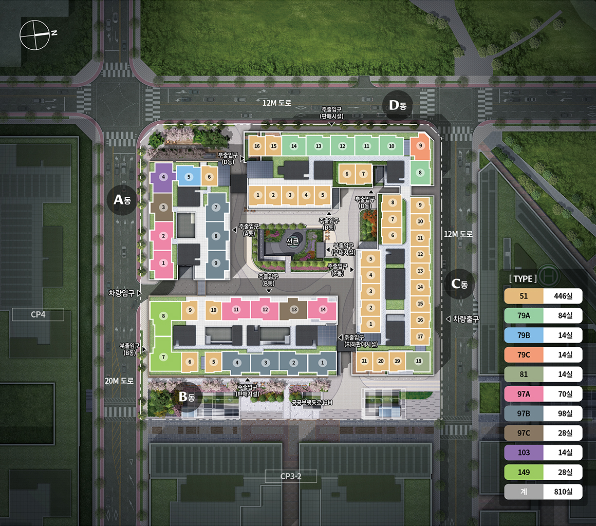 이와 같은 단위 세대 평면의 차이는 각 세대들을 대지 위에 배치할 때도 차이를 만들어냅니다. 정방형 평면은 장방형 평면 대비 같은 폭의 대지에서 더 많은 세대를 남향으로 배치할 수 있는 이점이 있습니다. 타워형으로 배치할 경우에도 장방형 평면보다는 더 자유로운 평면 구획이 가능합니다. 시니어하우징의 세대 내 세대원 수가 평면의 형태, 나아가 단지 내 배치 구성도 변화시키게 되는 것입니다.