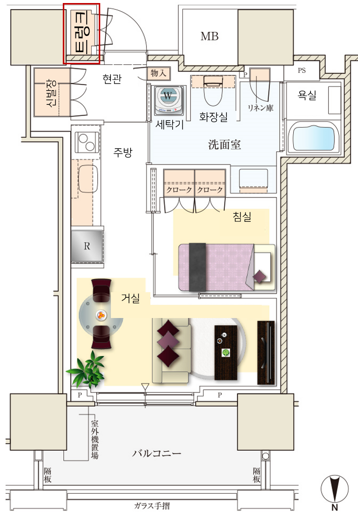 이에 더해 일본의 사례에서는 창고를 세대 외부에 두는 경우도 있습니다. 미쓰이 부동산이 운영하는 파크웰스테이트 니시아자부도 아래 평면도와 같이 집에 붙어는 있지만, 집 내부가 아닌 외부에서 열 수 있는 트렁크룸을 배치했습니다. 창고를 외부에 두어 무거운 짐을 옮길 때, 혹은 골프백 등을 차량에 넣을 때와 같은 상황에서 직원이 집 안에 들어오지 않고도 운반 서비스를 제공받을 수 있습니다.
