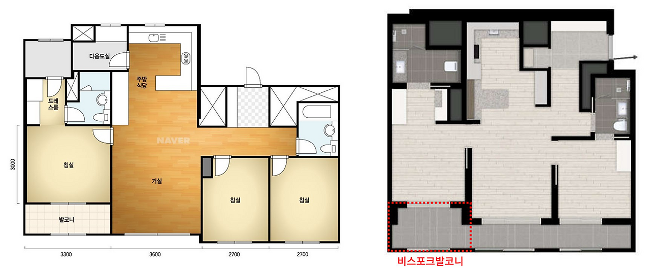 아래의 사진 중 왼쪽의 사진은 일반적인 59 type 아파트의 (래미안 원베일리 공급 80㎡, 전용 59㎡) 평면이고, 오른쪽은 최근 분양을 한 시니어하우징인 VL 르웨스트의 79 type (전용 79㎡) 평면입니다. 아파트의 발코니는 확장이 가능한 점을 고려했을 때 59 type의 아파트와 79 type 시니어하우징의 실사용 면적은 유사합니다. 그러나 왼쪽 아파트는 한 방향으로 길게 펼쳐져 있는 반면, 오른쪽 시니어하우징은 좀 더 정방형에 가까운 형태를 보입니다. 왜 이런 차이가 발생할까요?