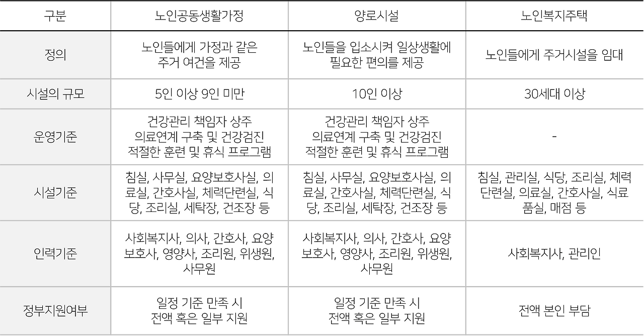 노인공동생활과정 및 양로시설과 노인복지주택은 단지 필수적으로 제공해야 하는 서비스측면에서만 차이가 있는 것은 아닙니다. 노인복지주택의 입주소는 국가로부터 입소비용을 전혀 지원받을 수 없는 반면, 노인공동생활가정과 양로시설의 경우 적절한 부양을 받지 못하는 노인이 시설 입소를 원하는 경우 지역구의 심사를 거쳐 전액 혹은 일정 금액에 대한 부분을 지원받을 수 있습니다.(생계급여수급자 및 의료급여수급자 또는 실비보호대상자 대상)