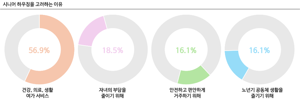 매거진한경에서 341명을 대상으로 조사한 자료에 따르면, 예상대로 절반이상의 설문자들이 건강, 의료, 생활여가 서비스를 시니어 하우징을 고려하는 첫번째 이유로 뽑았습니다. 우리가 일반적으로 생각하던 젊은층의 서비스 지향적인 성향만큼이나, 노인들도 질 좋은 서비스에 대한 수요가 높다는 것을 엿볼 수 있는 부분입니다. 바로 다음으로 뽑힌 항목은 자녀의 부담을 줄이기 위해 입니다. 2010년대에 들어서서 높은 물가, 특히 주거비용으로 인해 젊은층이 스스로 자리잡기에도 부담스러운 시대가 되었습니다. 그렇기에 부모까지 추가적으로 부양할 여력이 되는 젊은이들은 정말 소수에 불과할 것인데, 이러한 환경에서 부모님들께서 자식들에게 짐을 지우길 원치 않으실 것이라는 것은 어찌보면 자연스러운 것 같습니다. 의외로 16.1%나 되는 시니어분들께서 공동체 생활을 즐기기 위해 항목을 택하셨습니다. 노년기의 외로움으로 인한 사회 문제가 대두되고 있는 만큼이나, 실제로 많은 분의 외로움에 대한 경계심이 드러나는 부분입니다.