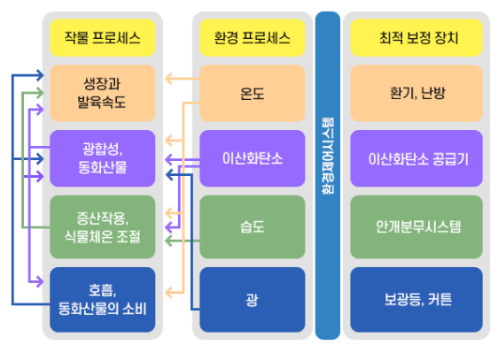광합성은 빛의 세기가 강할수록, 이산화 탄소의 농도가 높을수록 광합성량은 증가하나, 어느 한계까지 증가하면 포화점에 도달하여 더 이상 광합성량이 증가하지 않습니다. 따라서 임계점에 도달하기에 충분한 양을 제공하되 불필요한 비용 손실이 발생하지 않도록 제어하는 것이 중요합니다.