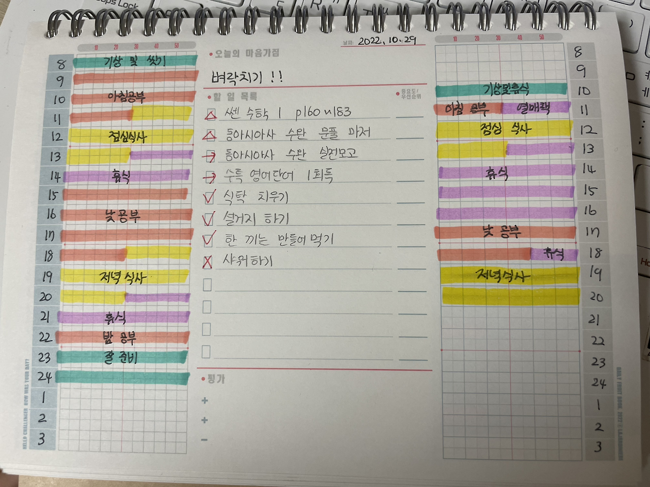시바는 열매책을 적극활용하고 있다. 매일 밤 스페를 하면서 항상 열매책을 쓴다. 우리 가좍 중에 꾸준함으로는 1등일 것이다. 시바는 타임트래커나. To Do List를 잘 활용해 하루를 알차게 채우고 있다. 시바의 영향으로 나도 열매책을 쓰기 시작했고, 열매책의 단점을 한 가지 발견했다. 계획한 것을 지키지 못하였을 때 후회와 자책이 밀려온다는 사실이다. 그러나 열매책을 자꾸 쓰면서 계획과 실행은 달라질 수밖에 없다는 사실을 점차 받아들이게 되었고, 내가 하루를 체계적으로 생각해 놓는다는 사실만으로 뿌듯해졌다.