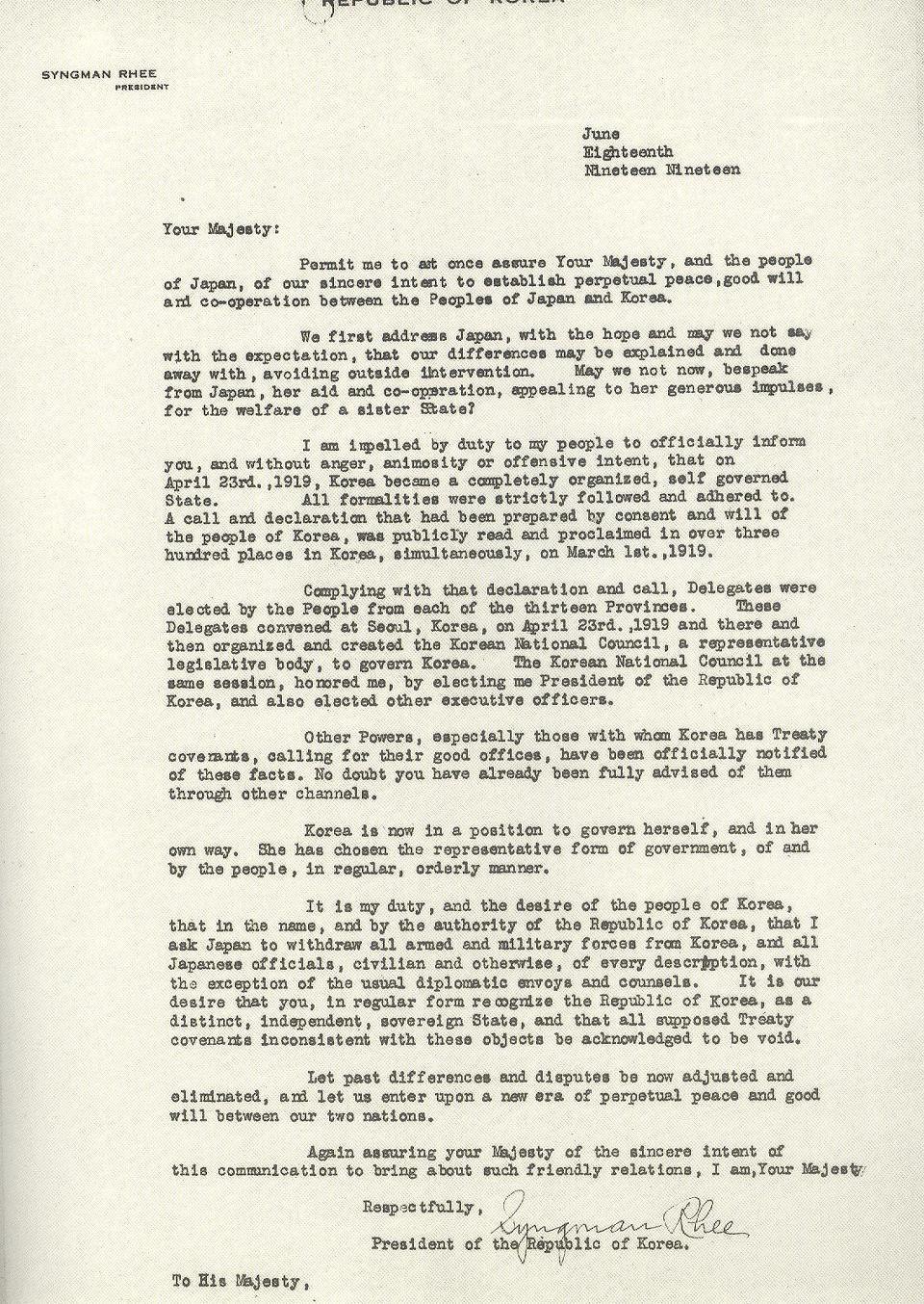 가장 널리 알려진 문건인 1919년 6월 이승만이 일본 국왕에게 보낸 공식 문서에서는 1919년 한국은 독자적이고 독립적인 주권국가이고, 3.1 독립선언서 낭독 및 선포 사실과 입법부를 구성했음을 명시했습니다. 그리고 대통령(이승만)을 비롯한 행정부 관리들을 선출했음을 전달하는 문건의 내용이었죠. 이는 곧 이승만의 단독정부가 비로소 대한민국의 시작이라고 보는 건국절 주장 측과는 전면 대치되는 자료인 것입니다. 결국 이승만조차도 1919년 임시정부 설립을 대한민국의 시작이라 말한 것이기 때문이죠.