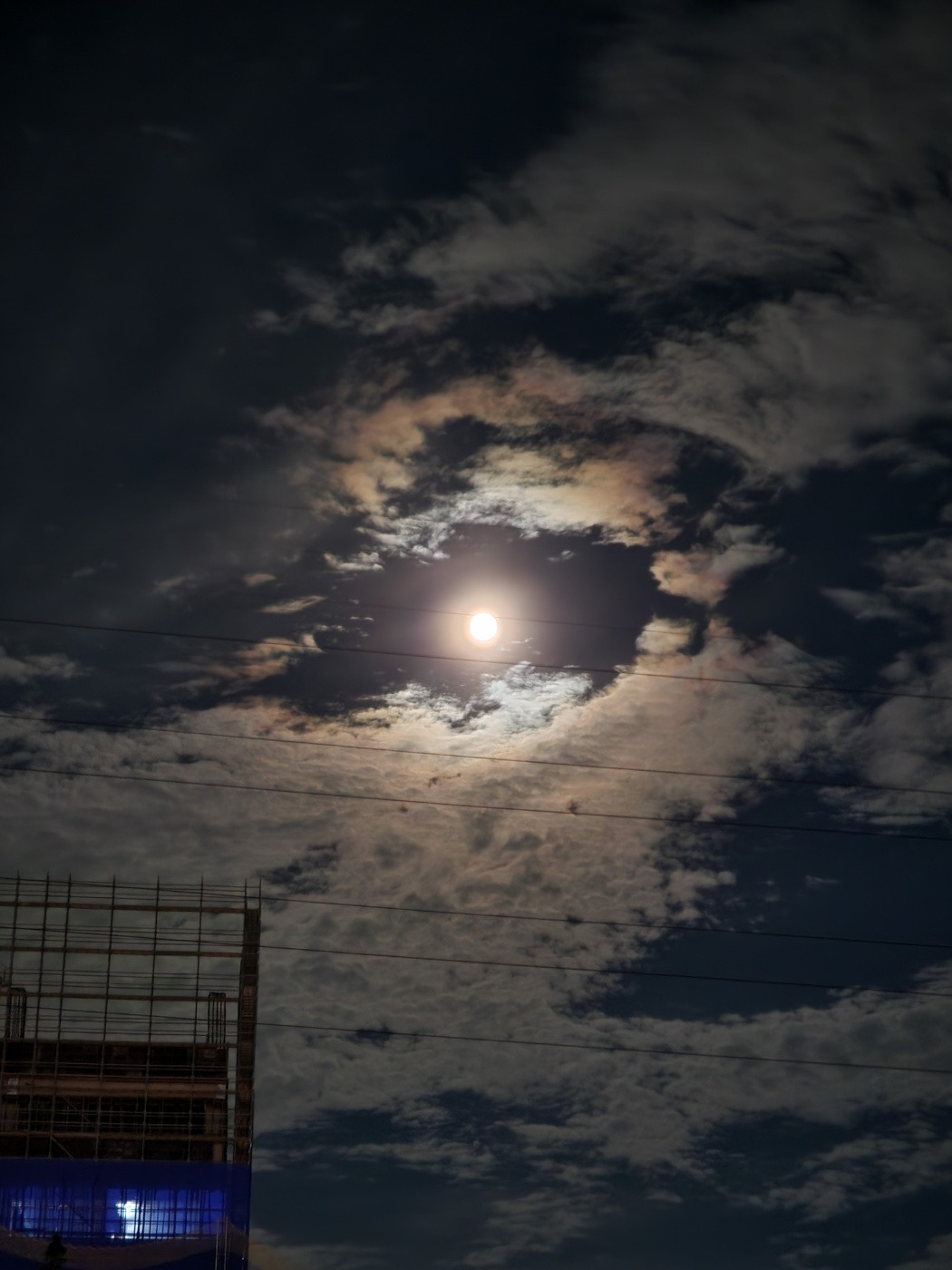 그런데 작년부터 낮보다는 밤하늘에 더 관심이 가기 시작했다. 그 전까지는 내가 밤하늘을 찍는 건 거의 달 사진을 찍을 때 밖에 없었다. 잘 안 풀리던 날들이었어서 그런가 하루 일과를 마치고 집으로 돌아오는 길에 밝게 떠 있는 달을 보면 마치 무언가를 염원하는 마음으로 그것을 사진에 담았던 것 같다. 보름달 뿐만 아니라 초승달이나 반달이 떴을 때에도 그냥 문득 걸어가다가 달이 예뻐보이면 스마트폰을 들어 프로 모드로 이것 저것 조절해가며 최고의 달 사진을 찍기 위해 가던 길을 멈추곤 했다. 프로 모드에 들어가 울트라 줌으로 달을 선명하게 찍으면, 그 주변 하늘은 먹칠을 한 것처럼 모두 까맣게 변한다. 그래서 사실 그 사진 안에는 달 이외에 무언가가 거의 드러나지 않았다. 그런데 작년에 밝게 뜬 보름달 주위로 달빛에 비쳐 달을 감싸고 있는 구름이 너무 멋있어 보여 사진에 담았었다. 그 후부터 꼭 달 사진이 아니더라도 밤하늘도 낮처럼 찍기 시작했다. 낮에 보는 하늘만큼 매일 선명하게 무언가가 보이지는 않아도 대신에 고층 건물들의 불빛들이 그 빈자리를 채워주었고, 그것은 그것대로 나름 매력이 있었다.
