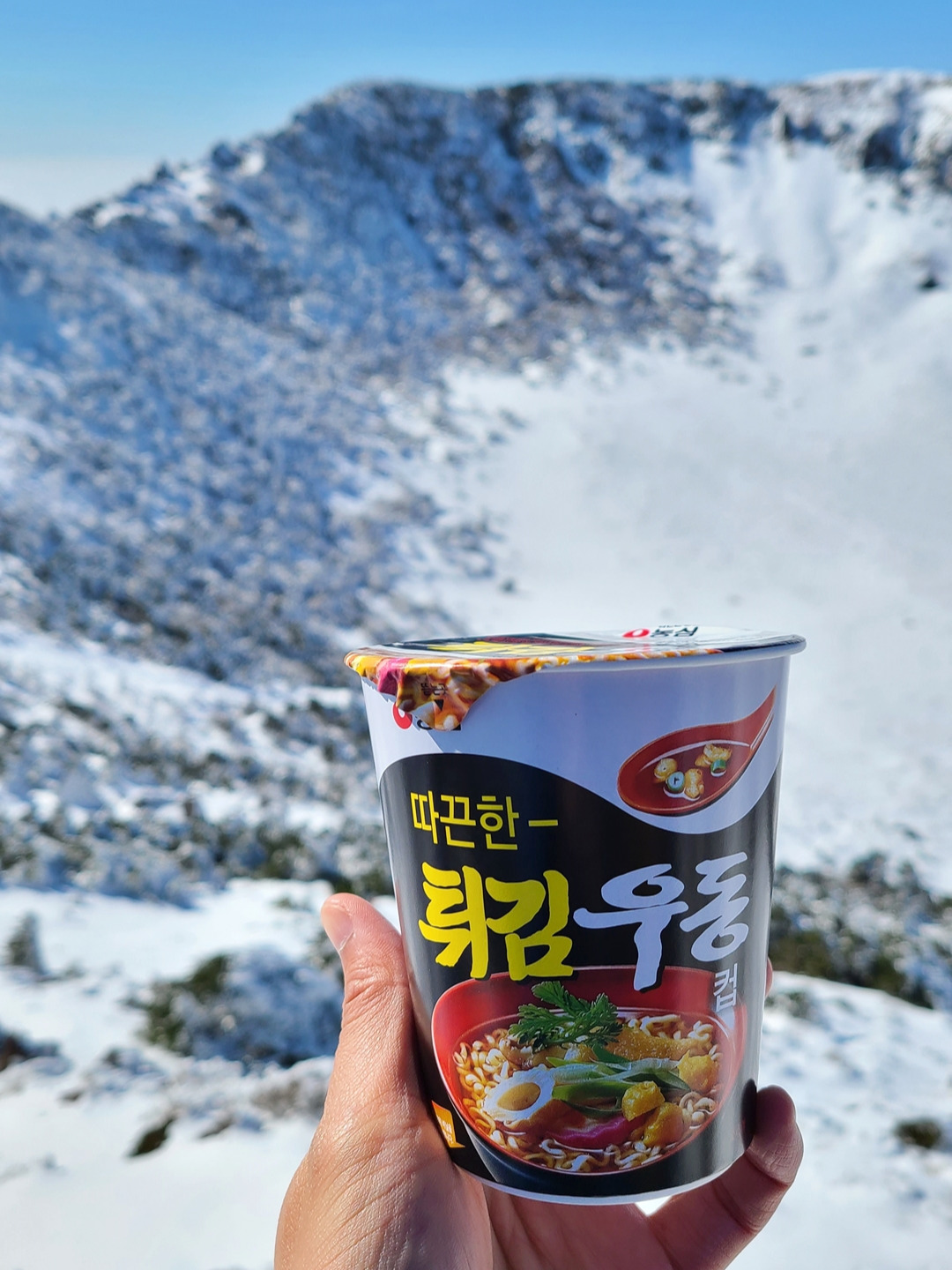 그렇다면 여기서 질문. 나는 왜 그렇게 한라산 정상에 악착같이 올라야 했는가? 여러 이유들이야 많겠지만, 백록담 배경으로 김이 모락모락 나는 튀김 우동 컵라면 인증샷을 찍고 싶었다. 누가 시켜서 그런 건 아니고 순전히 내 욕심이었다. 여러분, 인증사진에 집착하는 K-등산러가 바로 여기 있습니다...