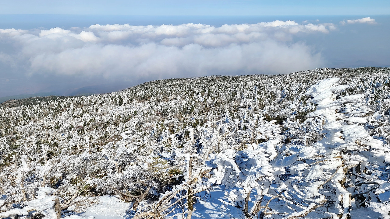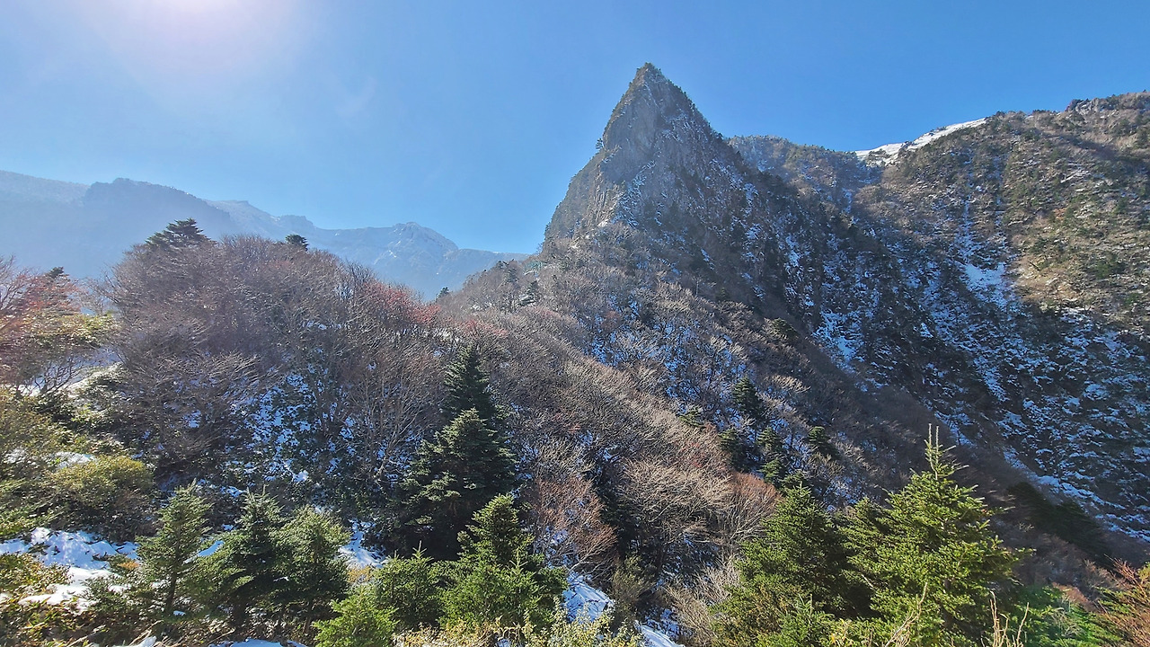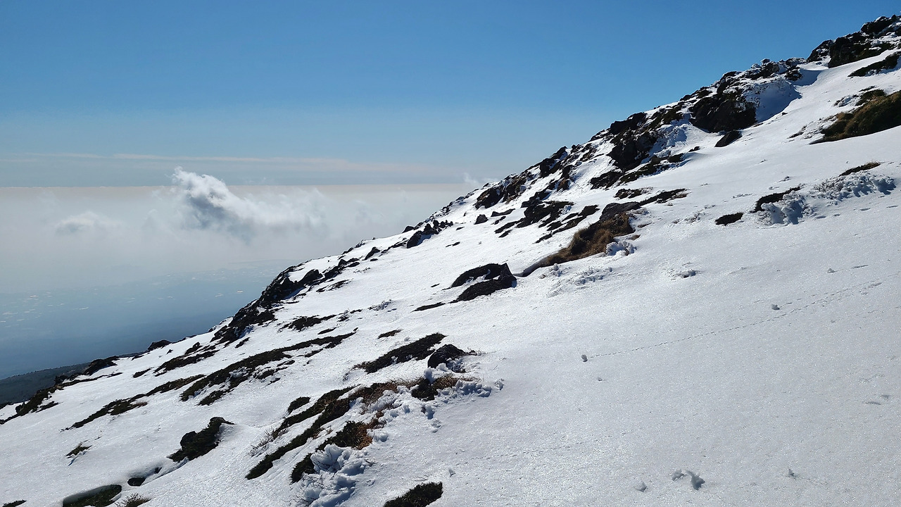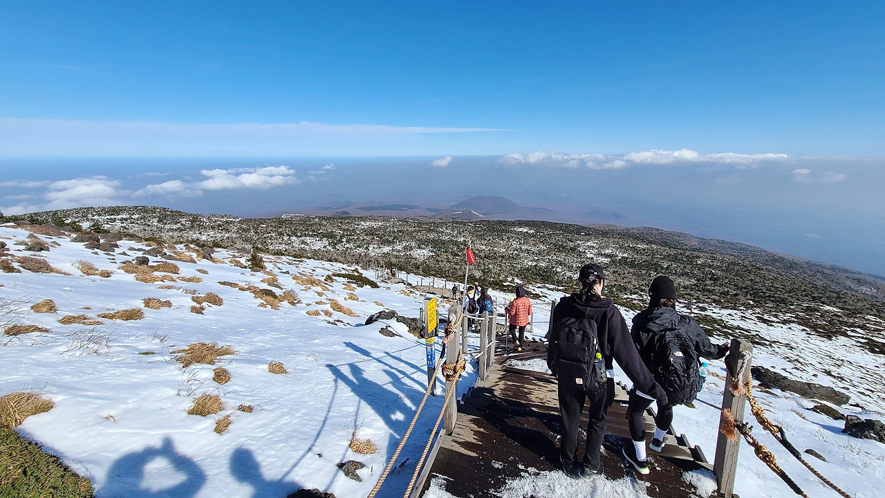 7시 반에 출발할 때는 쌀쌀한 가을 날씨였는데, 2시간 정도 지났을까. 어느새 해가 뜨고 기온이 오르면서 외투를 하나씩 벗기 시작했다. 그렇게 기온이 15도를 넘어가면서 어느새 반팔티 입고 눈밭을 걸어가는 이상증세에 도달하게 된다. 다행히 주변에는 반팔 티셔츠 입은 등산객 동지들이 있어 눈치 보지 않고 삼각봉까지 오를 수 있었다. 아이젠과 스틱 없이 호기롭게(는 사실 장비 없어서 못 샀음. 제주도에 11월 중반 폭설이 내리는 경우는 흔하지 않다고) 삼각봉 대피소에 이르니 그 풍경에 입이 떡 벌어졌다.