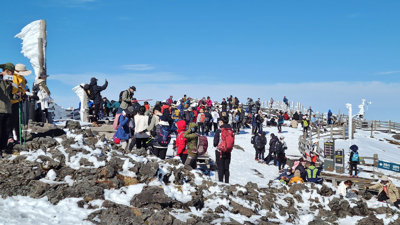 다행히도! 12시 50분 즈음 한라산 정상인 백록담에 무사히 도착했다. 기쁨의 눈물과 콧물을 닦는 것도 잠시, 수 백명의 등산객들로 북적한 모습을 보고 어안이 벙벙했다. 더구나 백록담까지 왔으니 비석 인증샷을 찍어야 했는데, 대기줄을 보아하니 최소 30분은 기다려야 할 것 같았기 때문. 1초의 망설임도 없이 다른 비석에서 사진을 찍기로 결심하고, 형을 기다리기로 했다. 이내 도착한 형과 함께 한라산 정상 인증사진을 남기고 눈 쌓인 백록담을 질릴 때까지 감상했다.