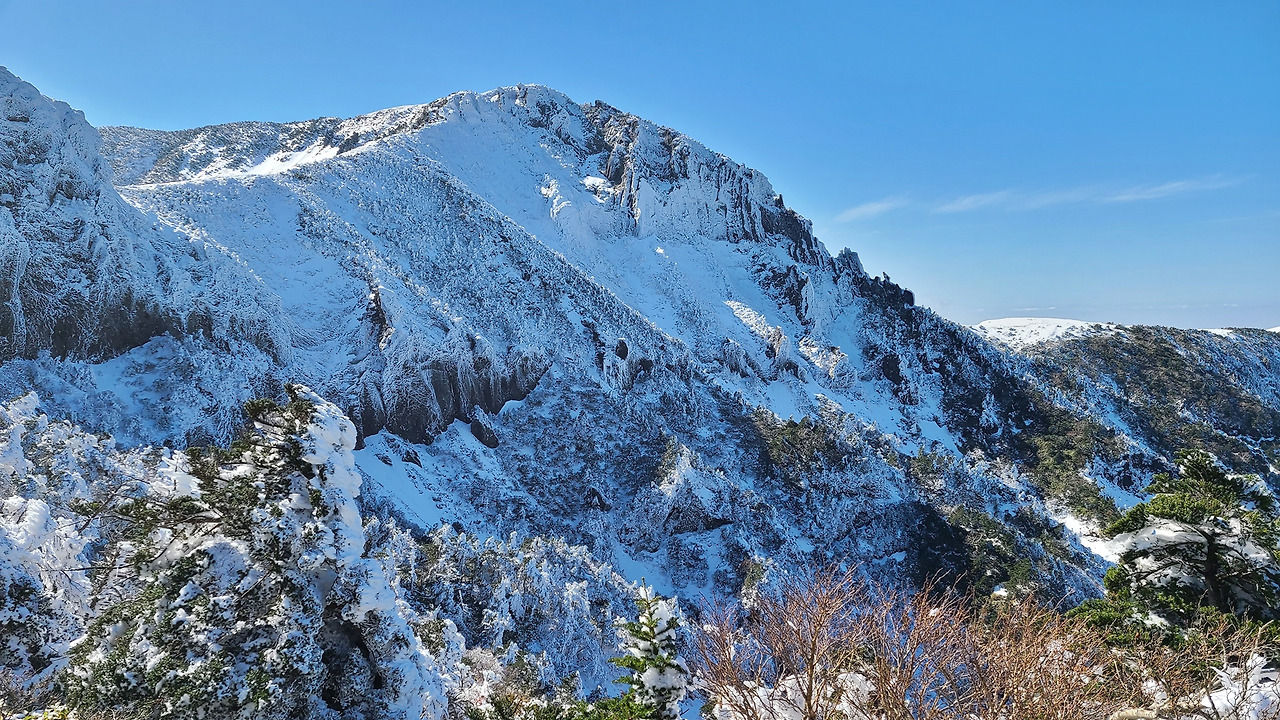 마침내. 그렇게 보고 싶다고 노래를 부르던 한라산의 설국이 펼쳐지기 시작했다. 욕 빼고 내가 알고 있는 모든 감탄사는 다 내뱉은 거 같은데, 10초마다 미친 풍경이 보이니까 결국 어휘력 고갈. 그렇게 '우와 미쳤다ㅏ!!!!!!' '찰칵'을 무한 반복하면서, 첫 한라산 등산 주제에 관음사 코스를 즐기는 경지에 이르게 된다. 물론 코스는 정말 헬 오브 헬. 아이젠과 스틱 없이 설산을 오르는 게 보통 쉬운 게 아니었기 때문. 다행히, 이러다 죽겠다 싶을 때면 죽어도 좋을 만큼 멋진 풍경으로 한라산은 나를 조련하고 있었다. 그렇게 얼굴이 콧물과 땀으로 범벅이 될지언정 사진 찍는 건 포기할 수 없었다. 언제 다시 이런 풍경을 볼까 싶어서 거의 기계처럼 휴대폰 셔터를 누르고 또 눌렀다.